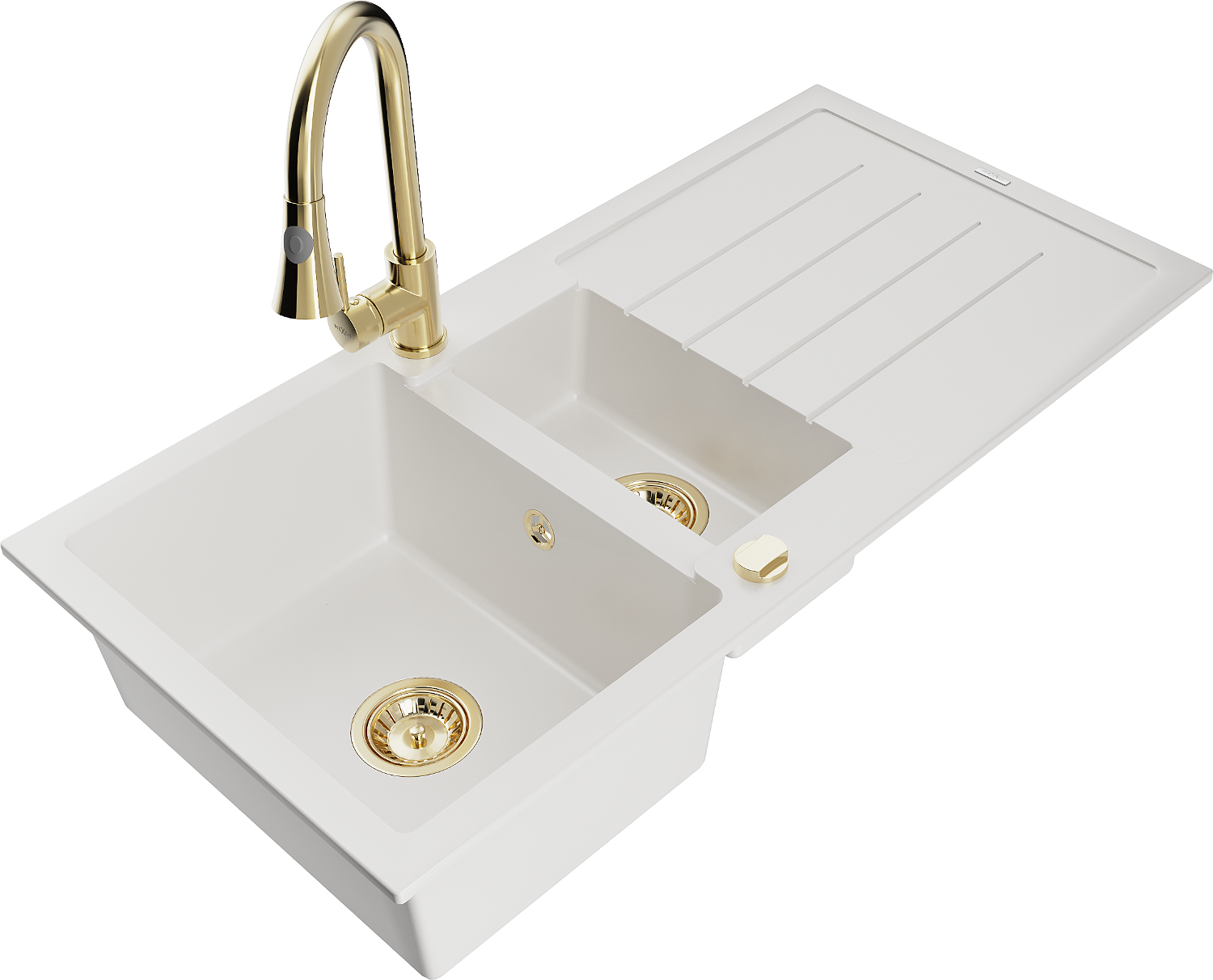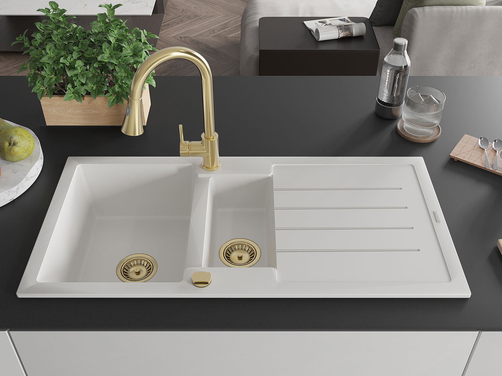 Mexen Andres granīta izlietne ar 1,5 nodalījumiem un noteces daļu, un virtuves jaucējkrānu Elia, balta - 6515-20-670101-50