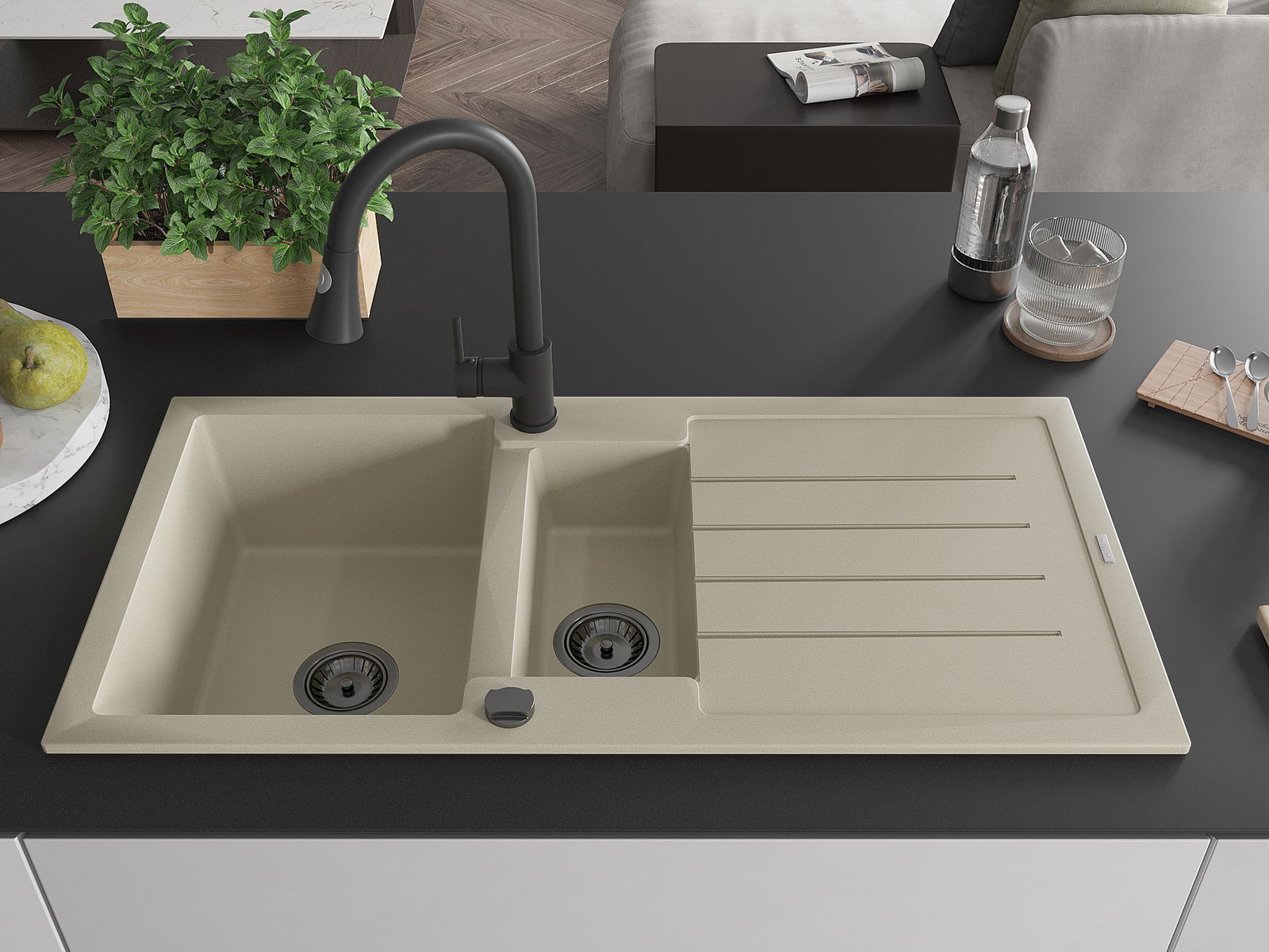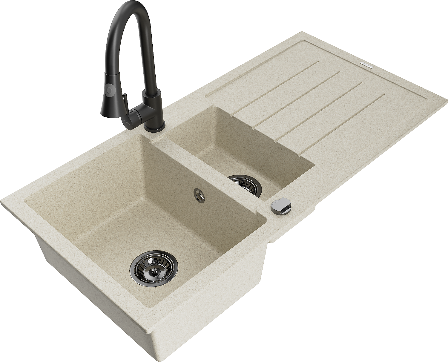 Mexen Andres Granitā izlietne ar 1,5 sekcijām un noteci, virtuves jaucējkrāns Elia, bēšs - 6515-69-670101-70