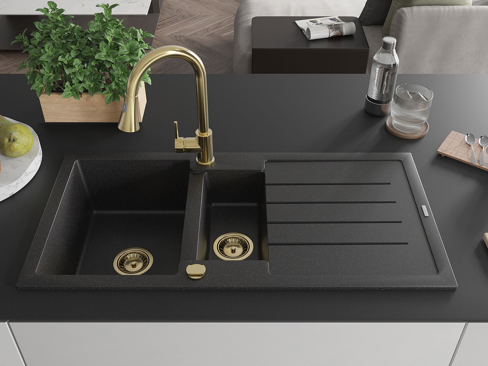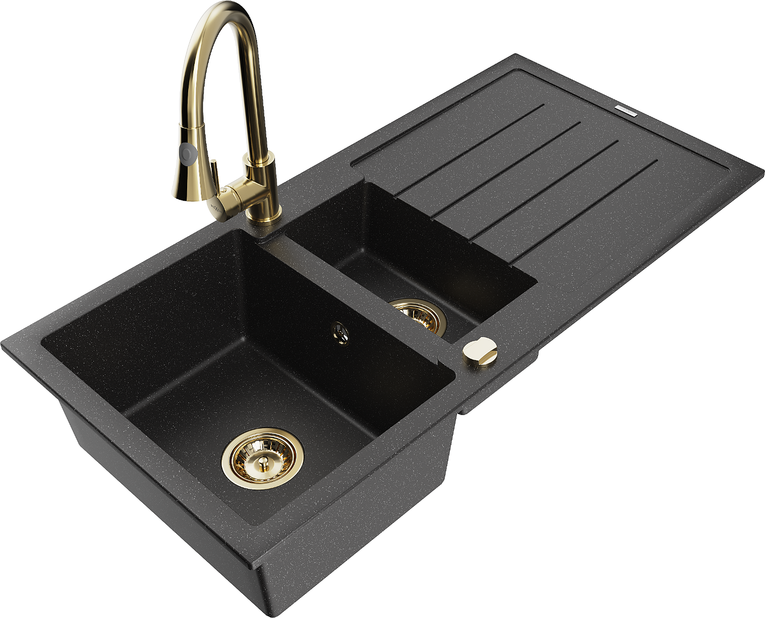 Mexen Andres granit izlietne 1,5 nodalījumu ar noteci un Elia virtuves maisītāju, melns/sudraba metāliks - 6515-73-670101-50