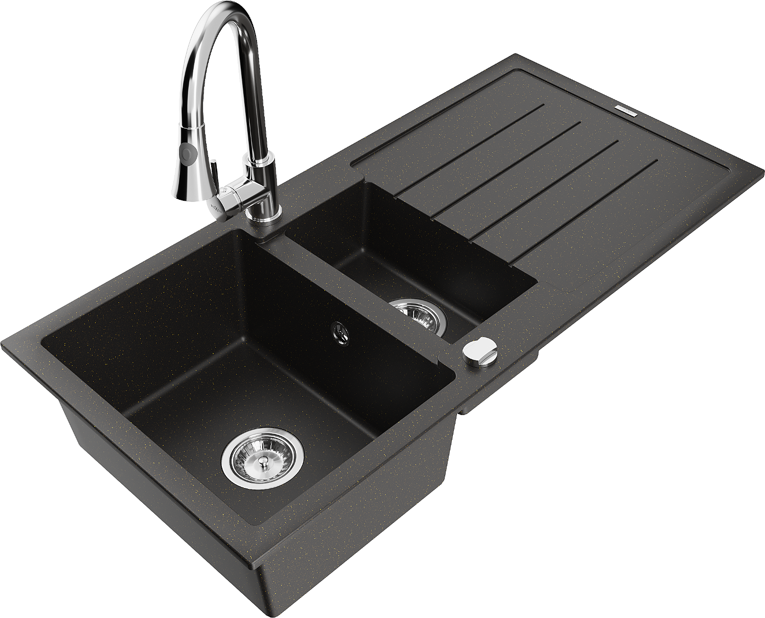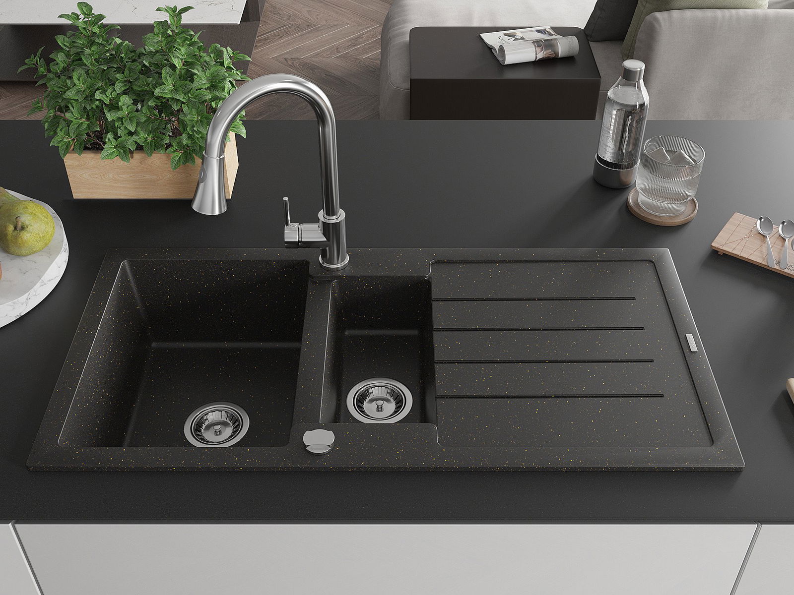Mexen Andres granitā izlietne ar 1,5 kamerām ar notecējumu un virtuves jaucējkrānu Elia, melns/zeltains metālisks