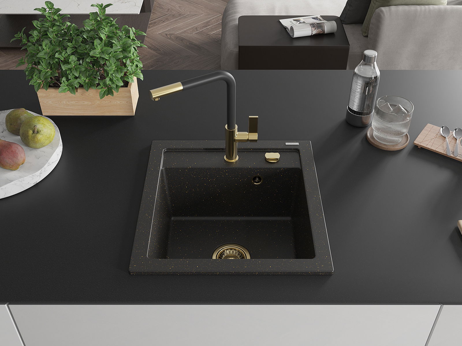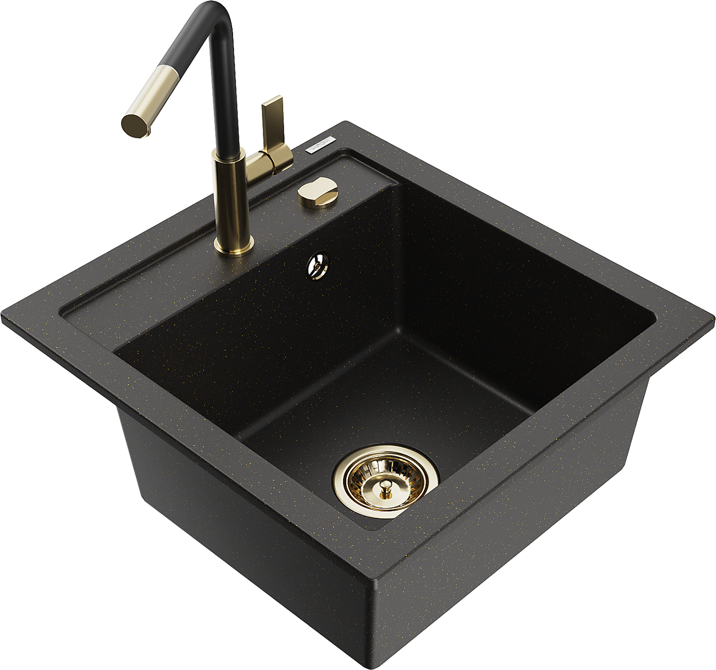 Mexen Vito granitē izlietne ar 1 nodalījumu un virtuves jaucējkrānu Flora, melna/zeltains metāliks - 6503-75-670401-57-G