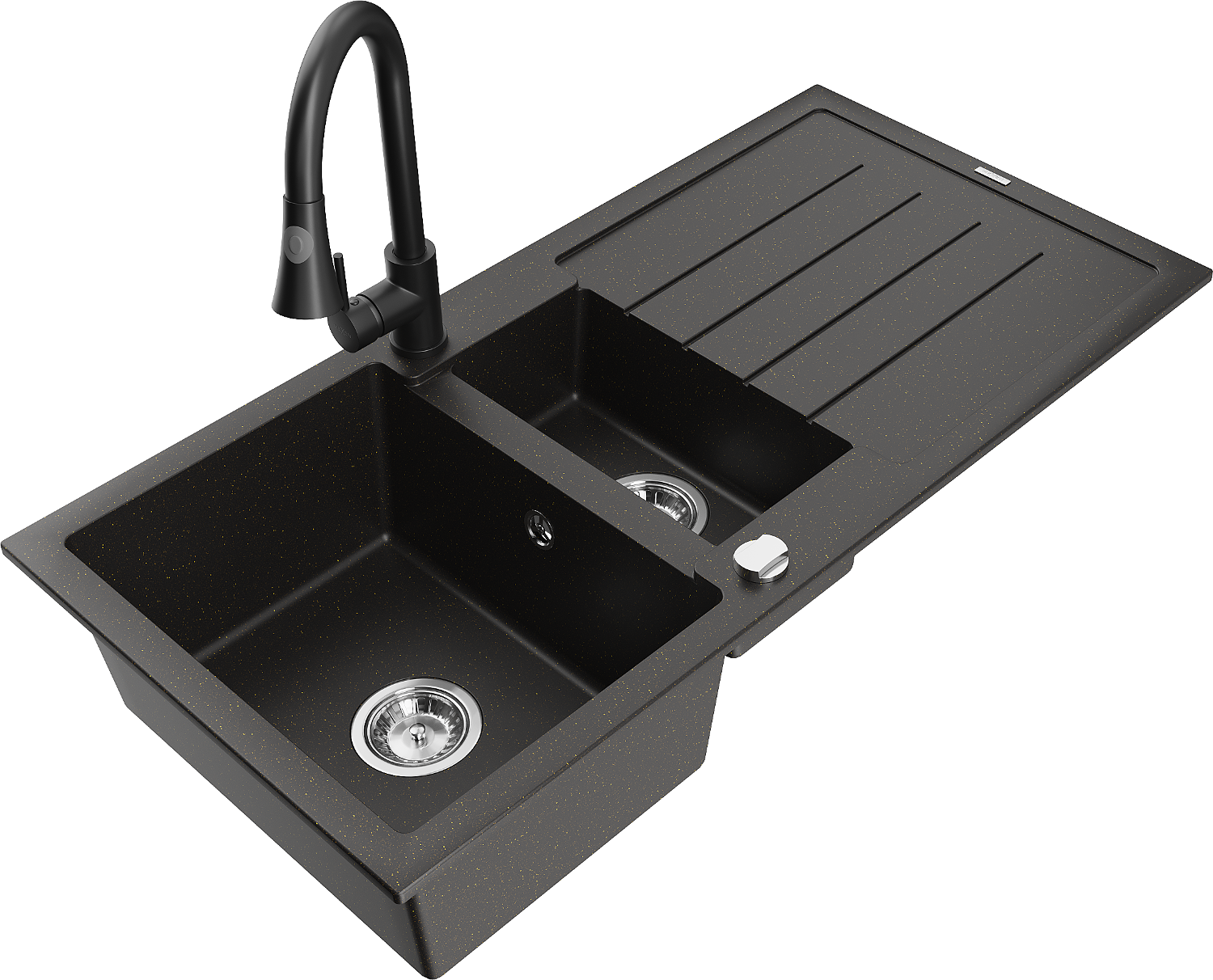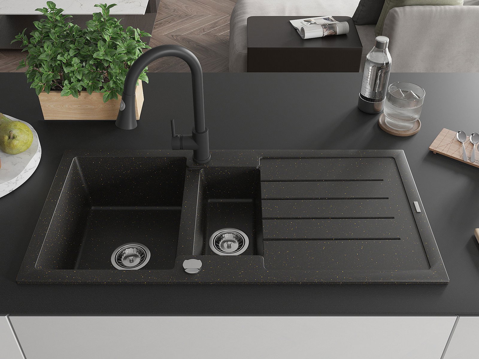 Mexen Andres granitizlietne 1,5 nodalījuma ar noteku un virtuves jaucējkrānu Elia, melns/zeltīts metālisks - 6515-75-670101-70