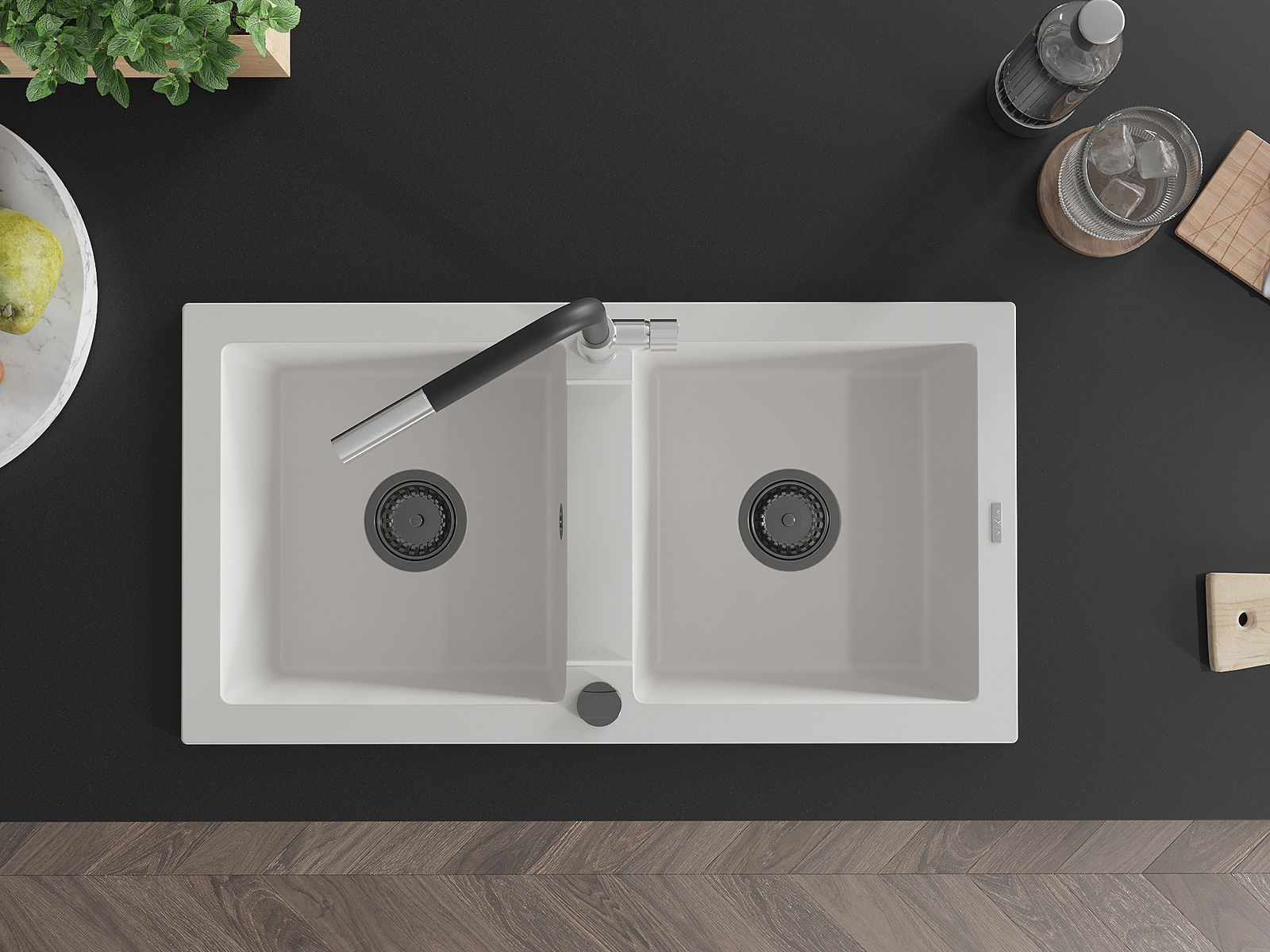 Mexen Mario divpadsmit granīta divbļodu izlietne ar Flora virtuves jaucējkrānu, balts - 6504-20-670401-07-B