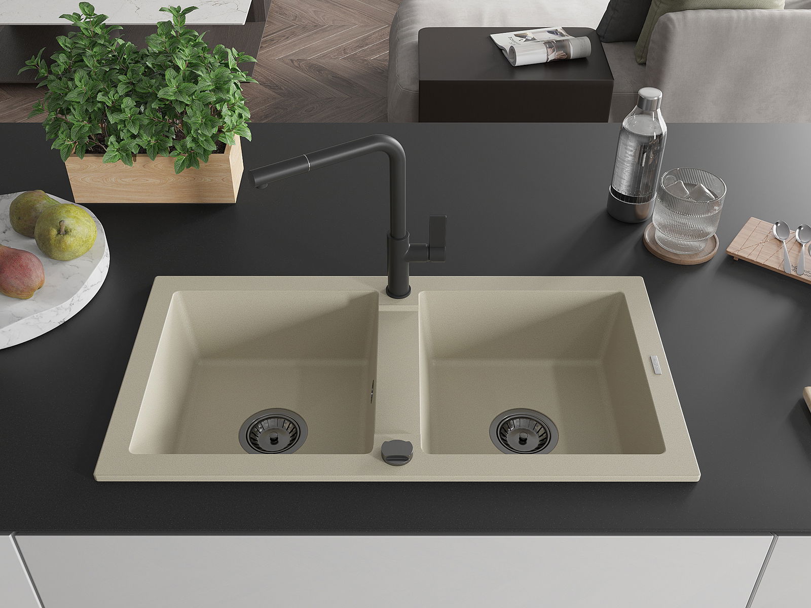 Mexen Mario divpadsmit granīta izlietne ar divām kamerām un Flora virtuves krānu, bēša - 6504-69-670401-70-B