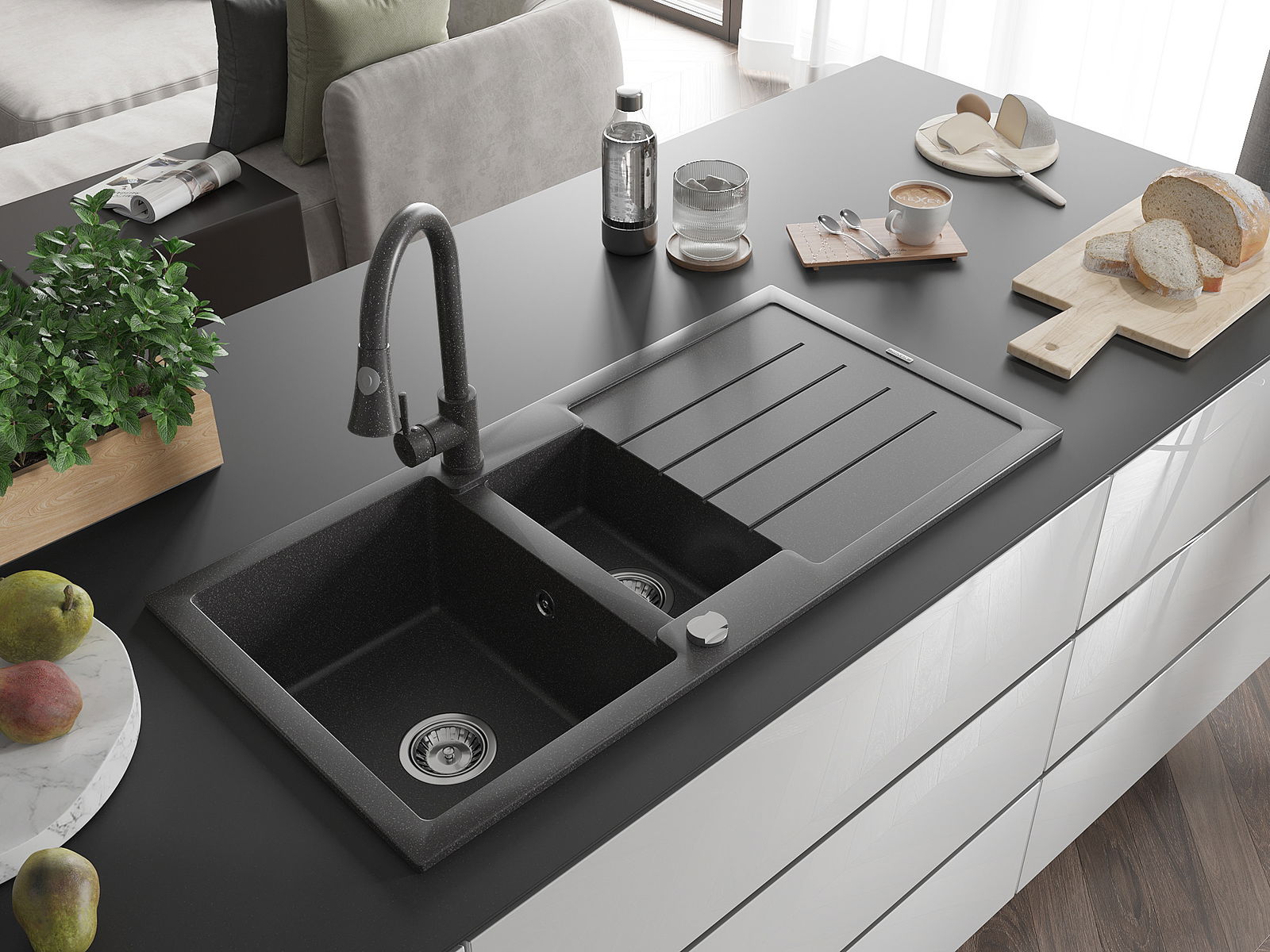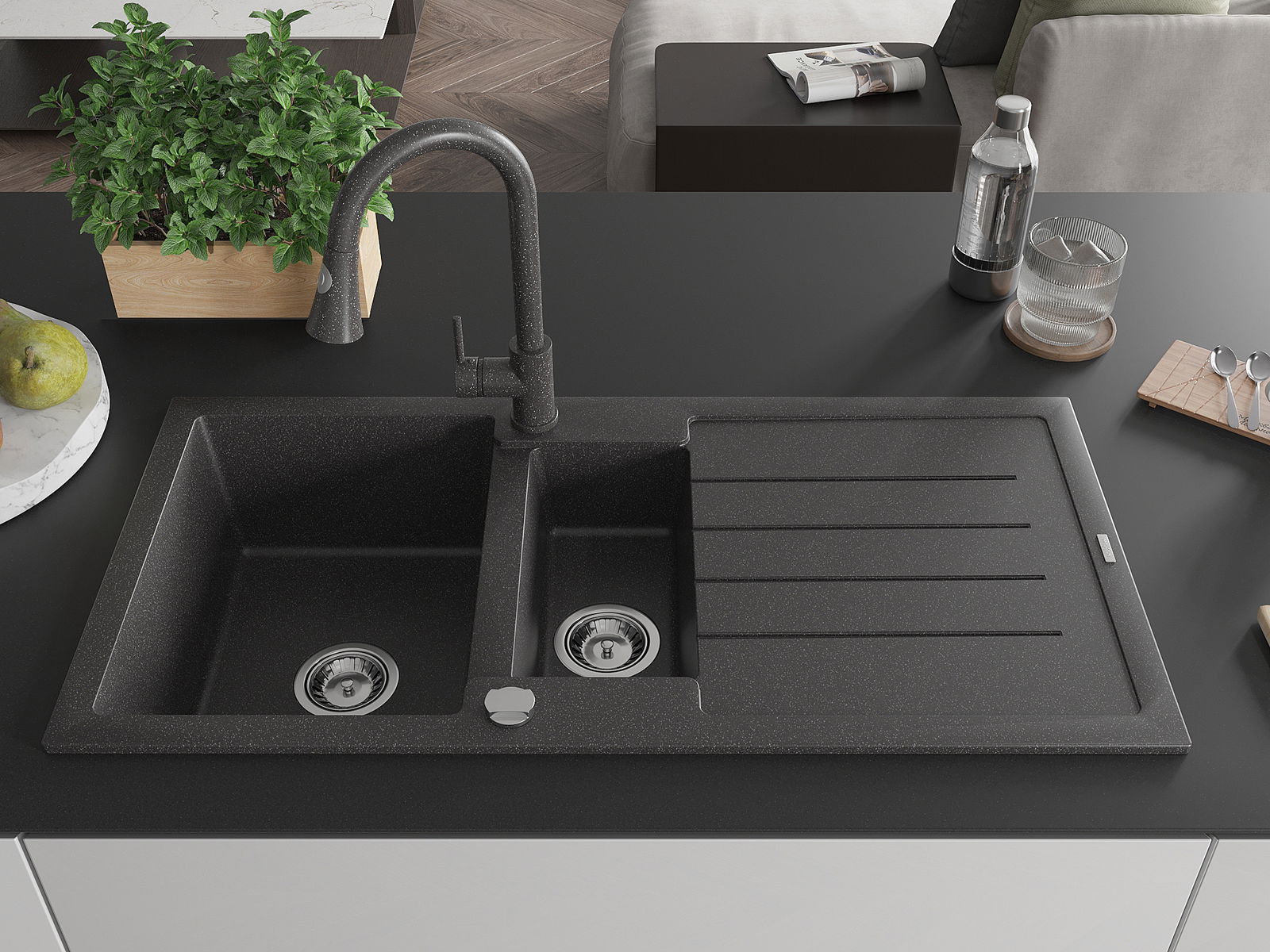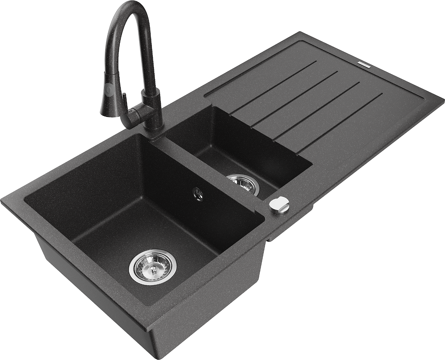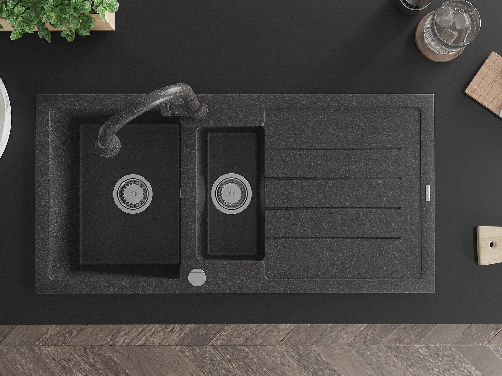 Mexen Andres granīta izlietne ar 1,5 nodalījumiem ar noteces un virtuves jaucējkrānu Elia, melna plankumaina - 6515-76-670101-76