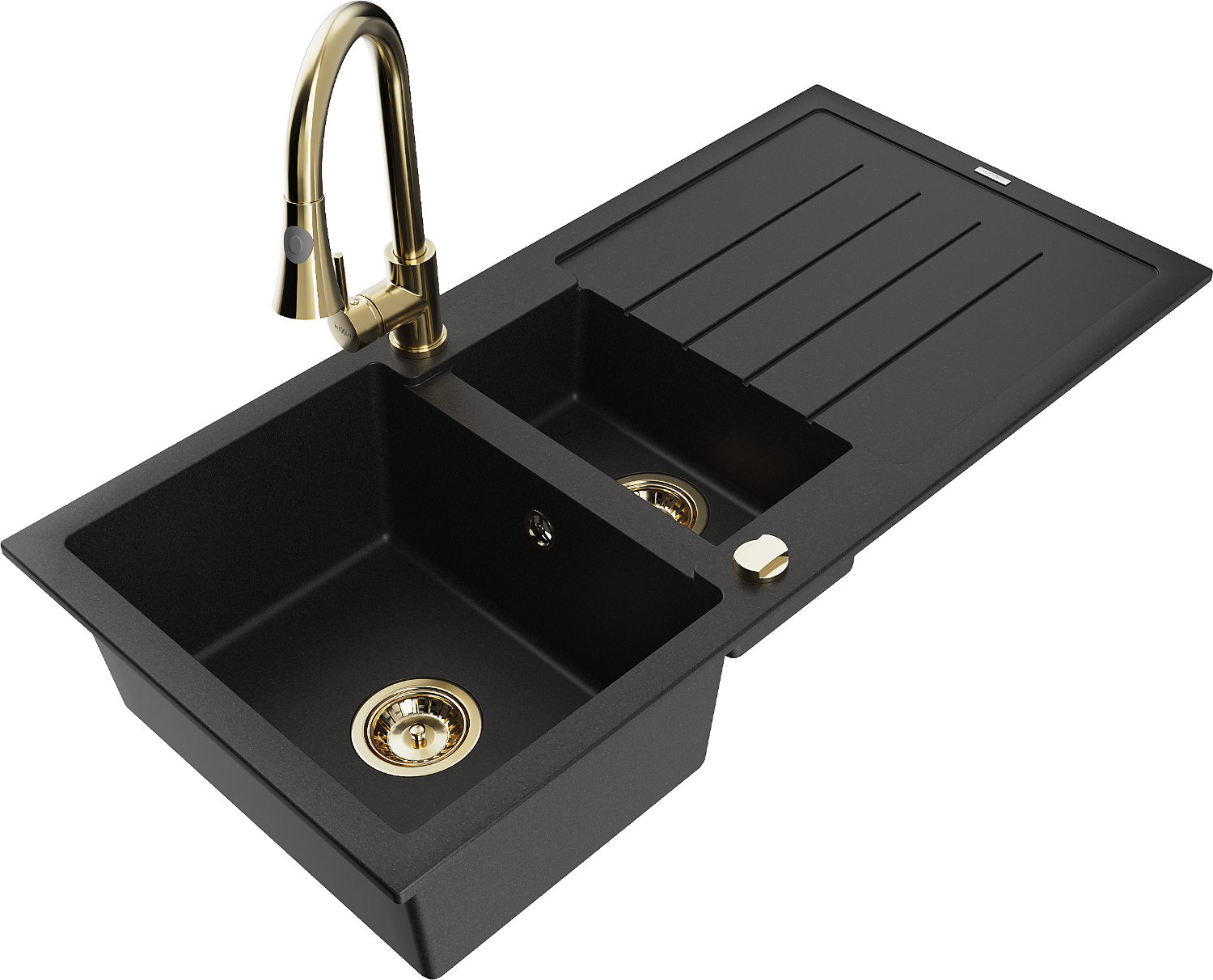 Mexen Andres granit izlietne ar 1,5 nodalījumu un noteku, ar Elia virtuves jaucējkrānu, melns - 6515-77-670101-50