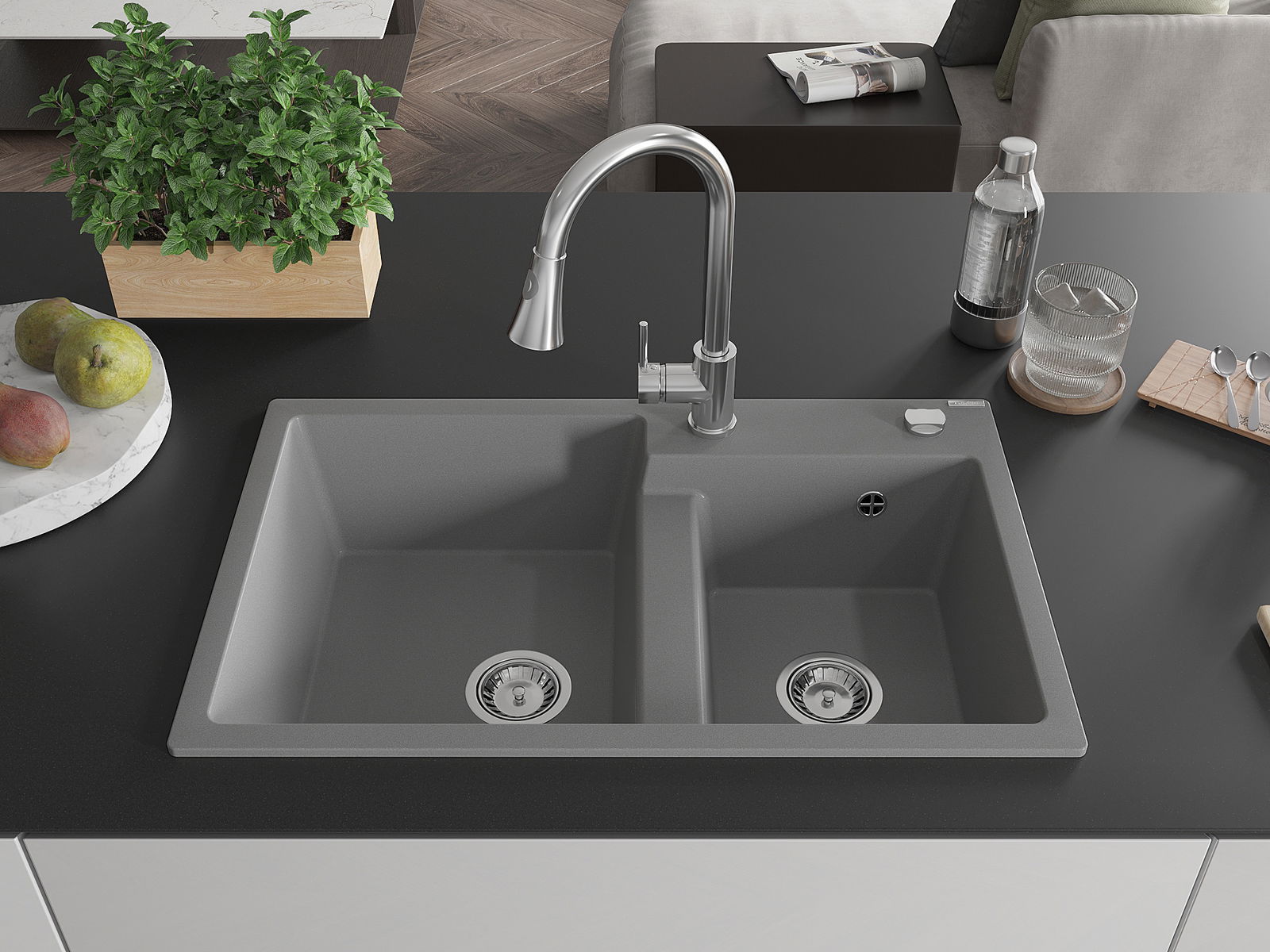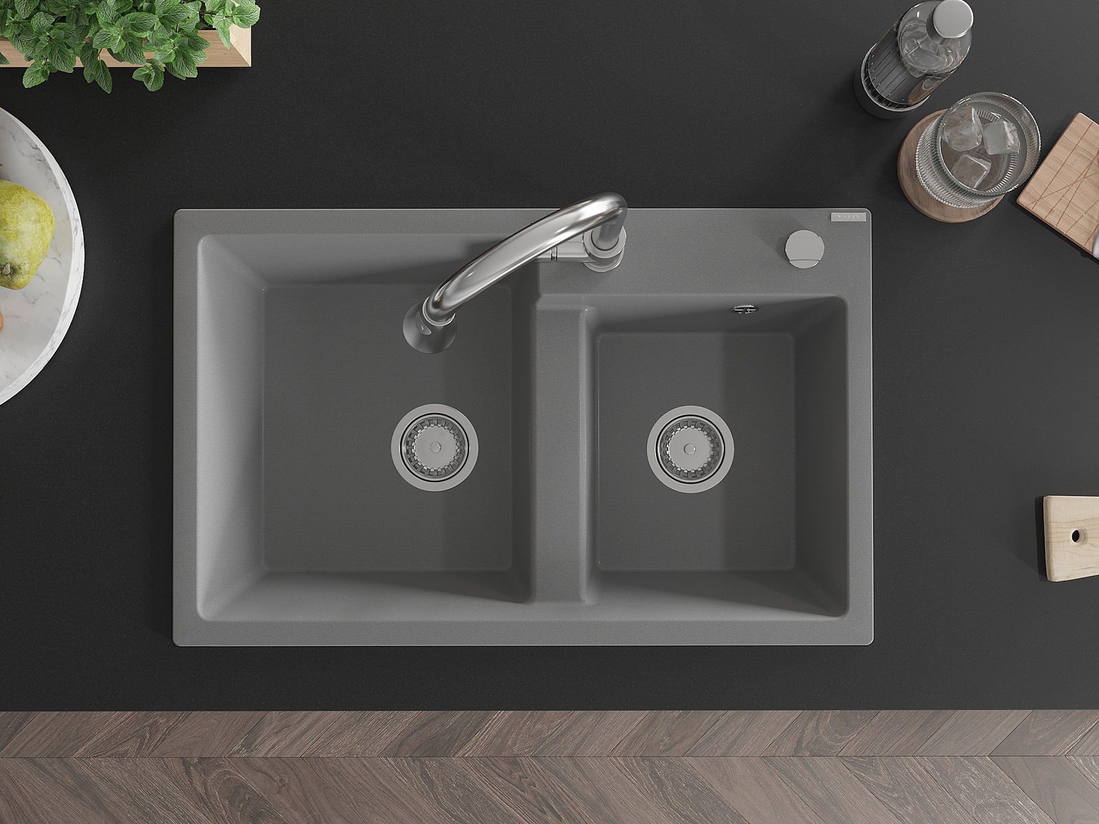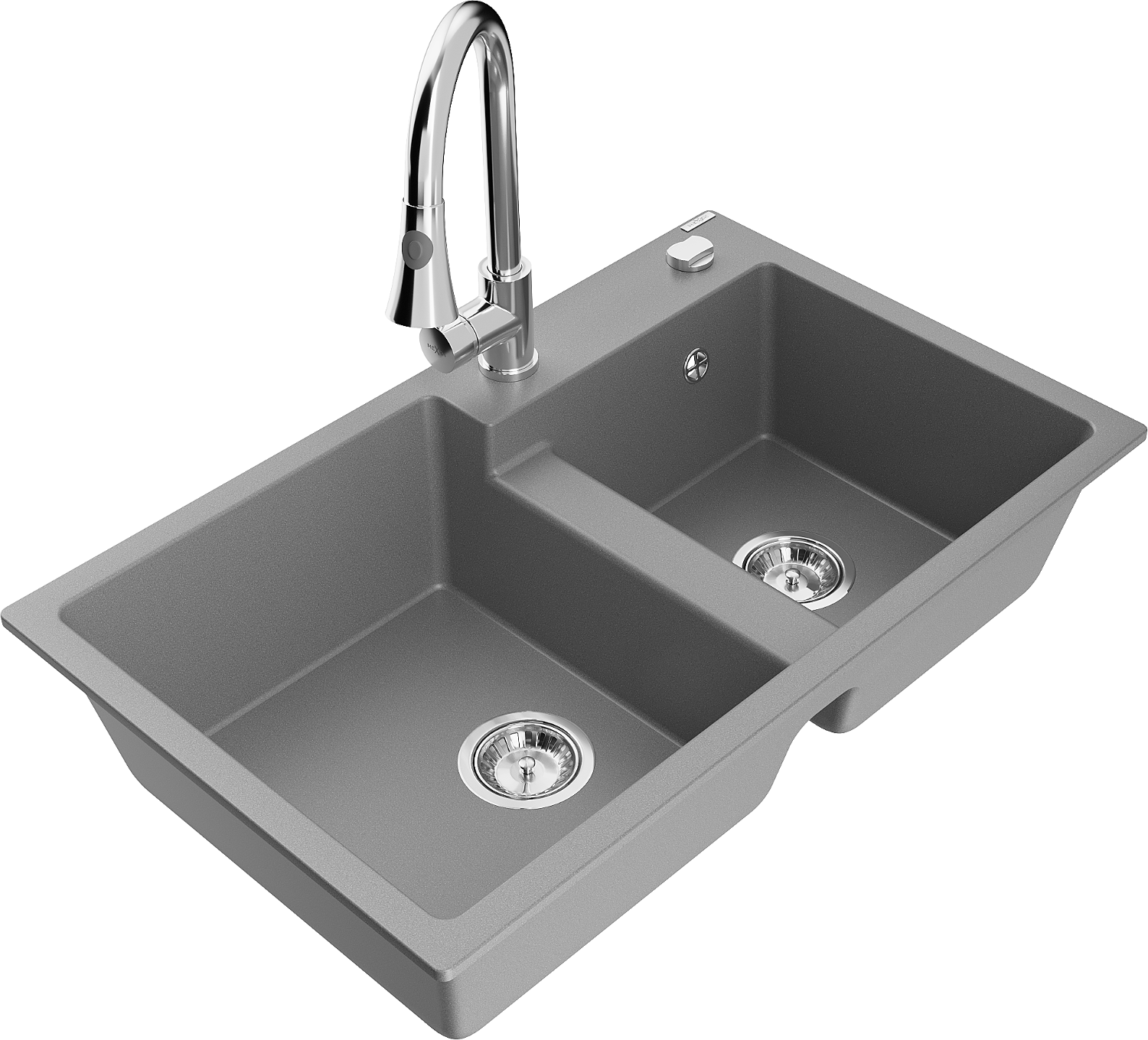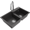 Mexen Tomas divu nodalījumu granīta izlietne ar virtuves jaucējkrānu Elia, pelēks - 6516-71-670101-00