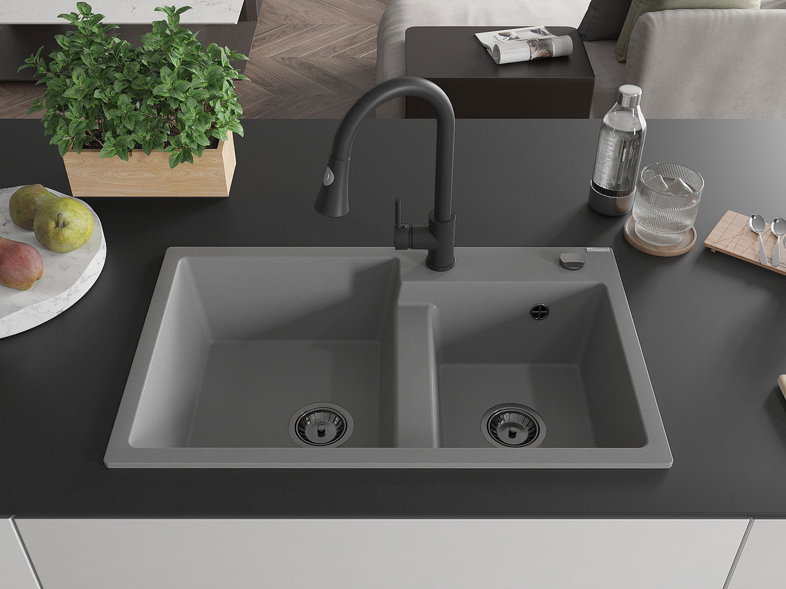 Mexen Tomas granīta izlietne ar 2 nodalījumiem un virtuves jaucējkrānu Elia, pelēka - 6516-71-670101-70-B