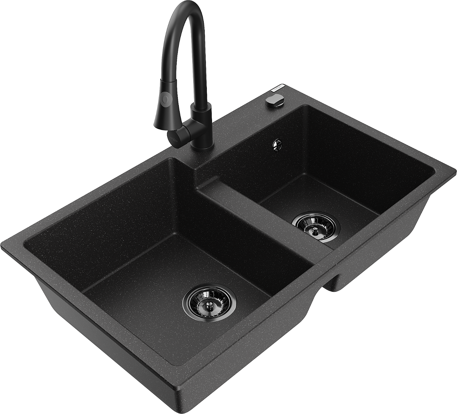 Mexen Tomas granitizlietne 2-kameru ar virtuves jaucējkrānu Elia, melns/sudraba metāliskais - 6516-73-670101-70-B