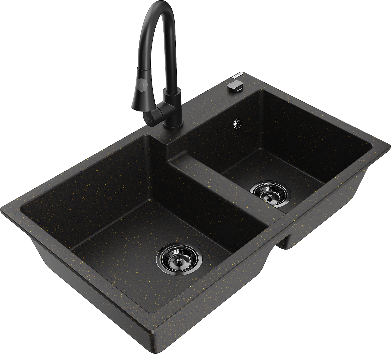 Mexen Tomas granitē izlietne ar 2 nodalījumiem un virtuves krānu Elia, melns/zeltīta metāliks - 6516-75-670101-70-B