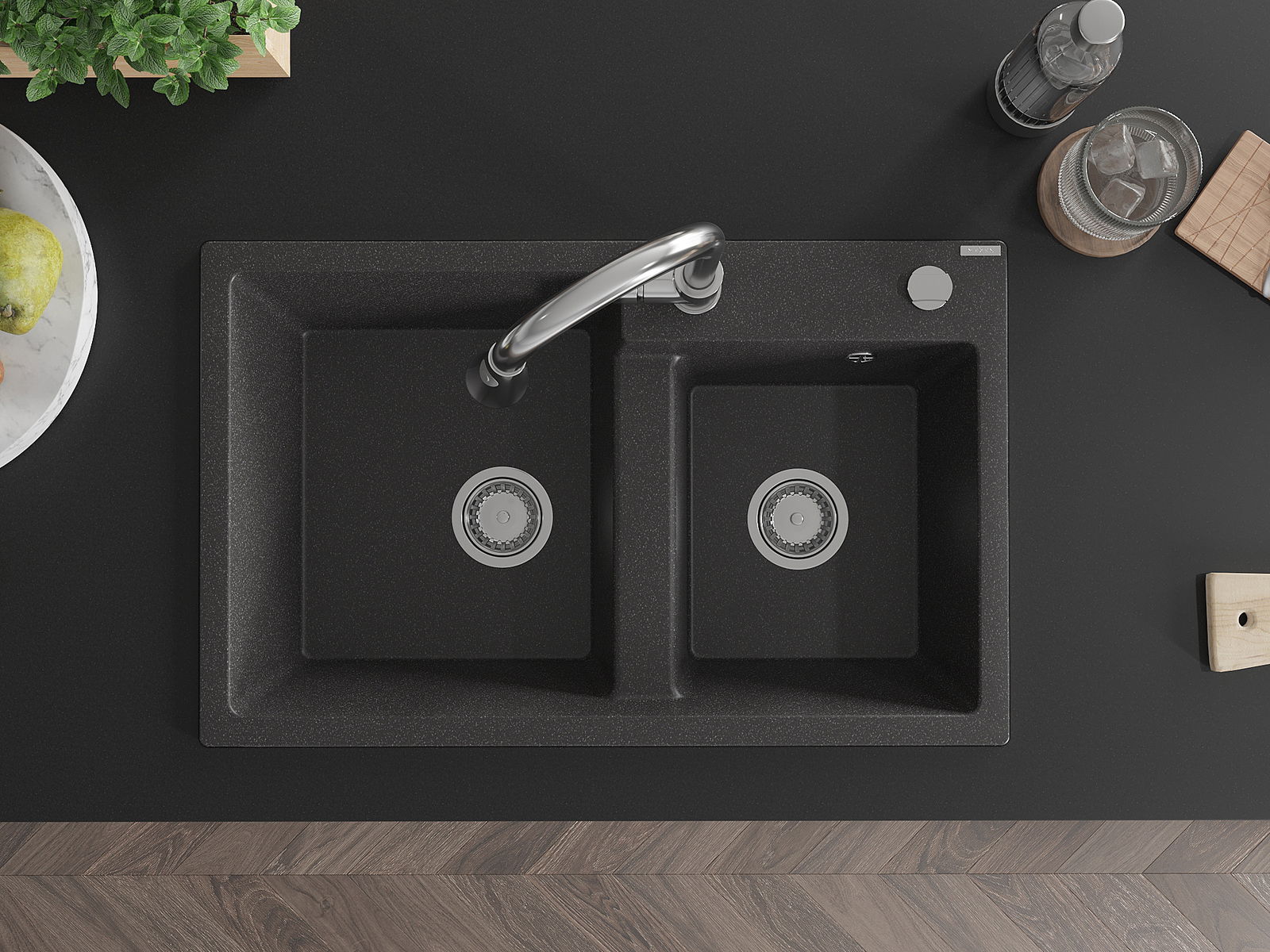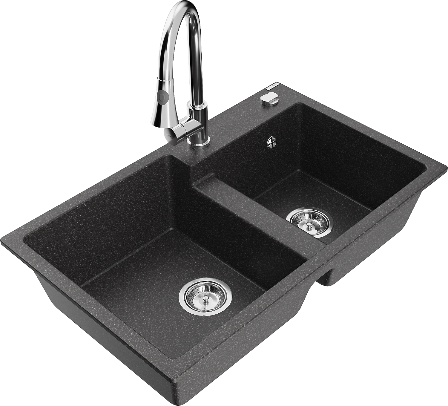 Mexen Tomas divpadsmit akmeņu izlietne ar 2 nodalījumiem un virtuves jaucējkrānu Elia, melna ar plankumiem - 6516-76-670101-00