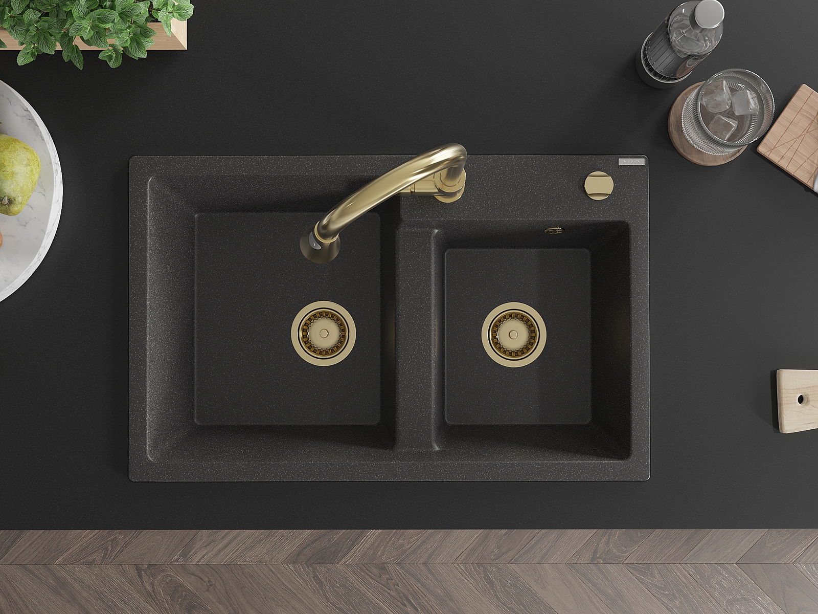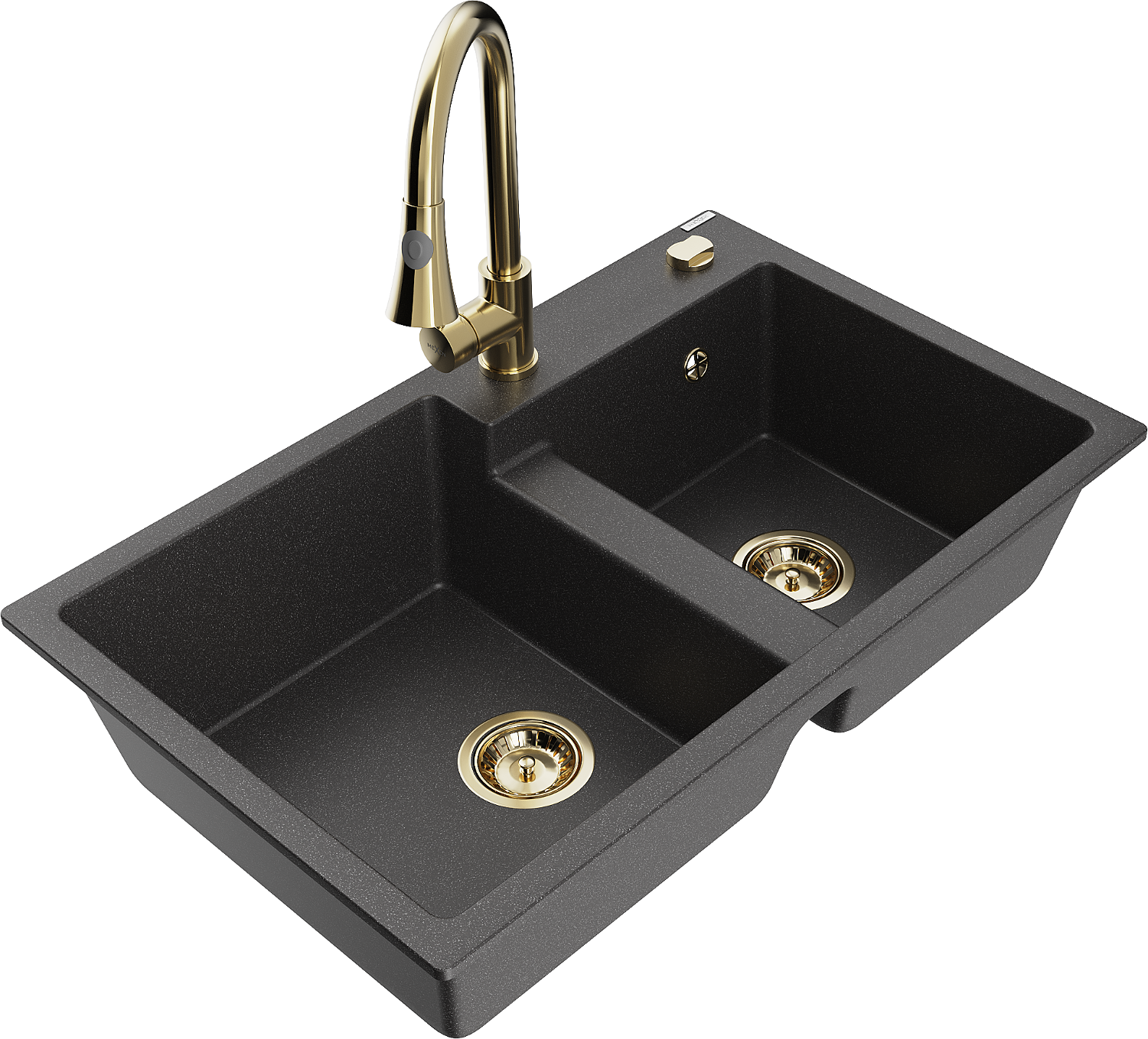 Mexen Tomas granīta izlietne ar 2 nodalījumiem un virtuves jaucējkrānu Elia, melni punktoti - 6516-76-670101-50