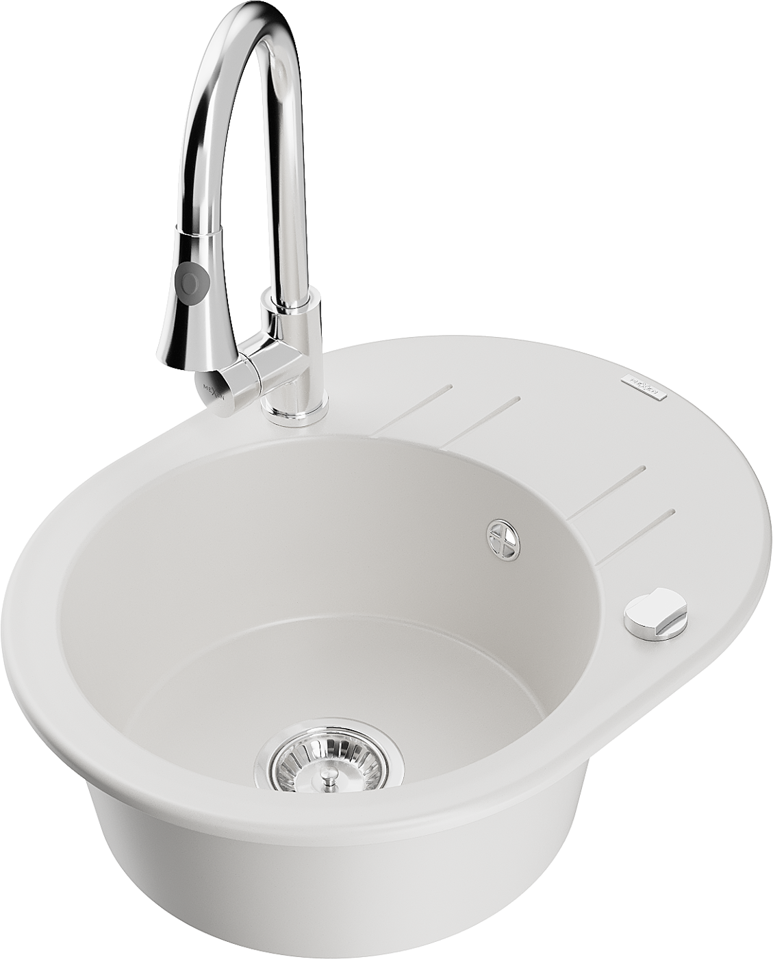 Mexen Kevin granīta izlietne, 1 nodalījums ar noteces paliktni un virtuves krānu Elia, balta - 6517-20-670101-00