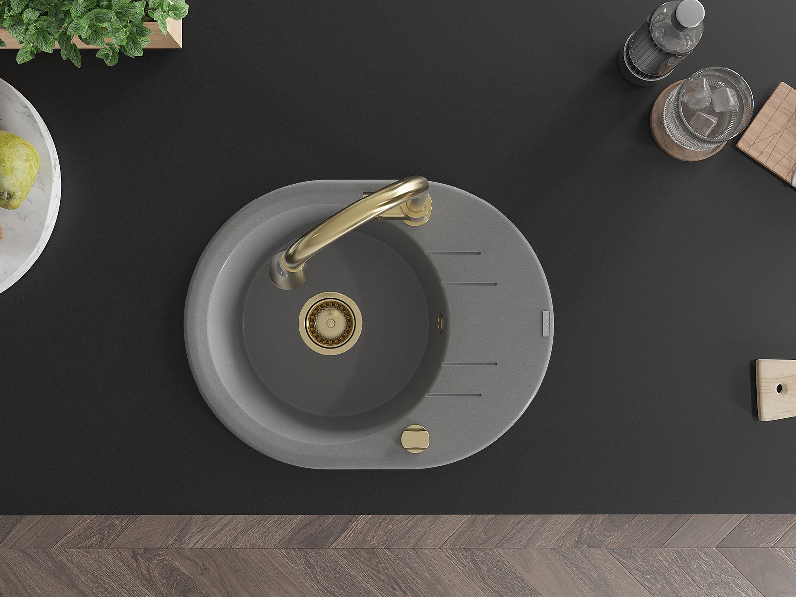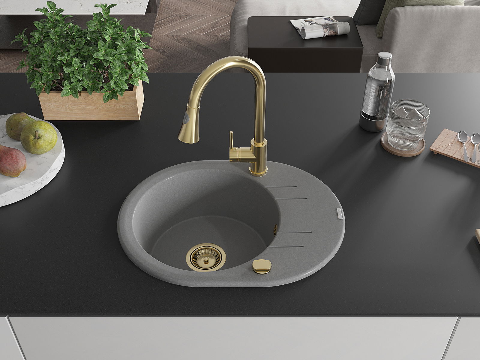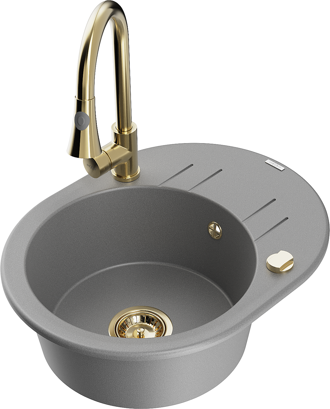 Mexen Kevin granitizlietne ar vienu nodalījumu un žāvētāju un virtuvē jaucējkrānu Elia, pelēka - 6517-71-670101-50