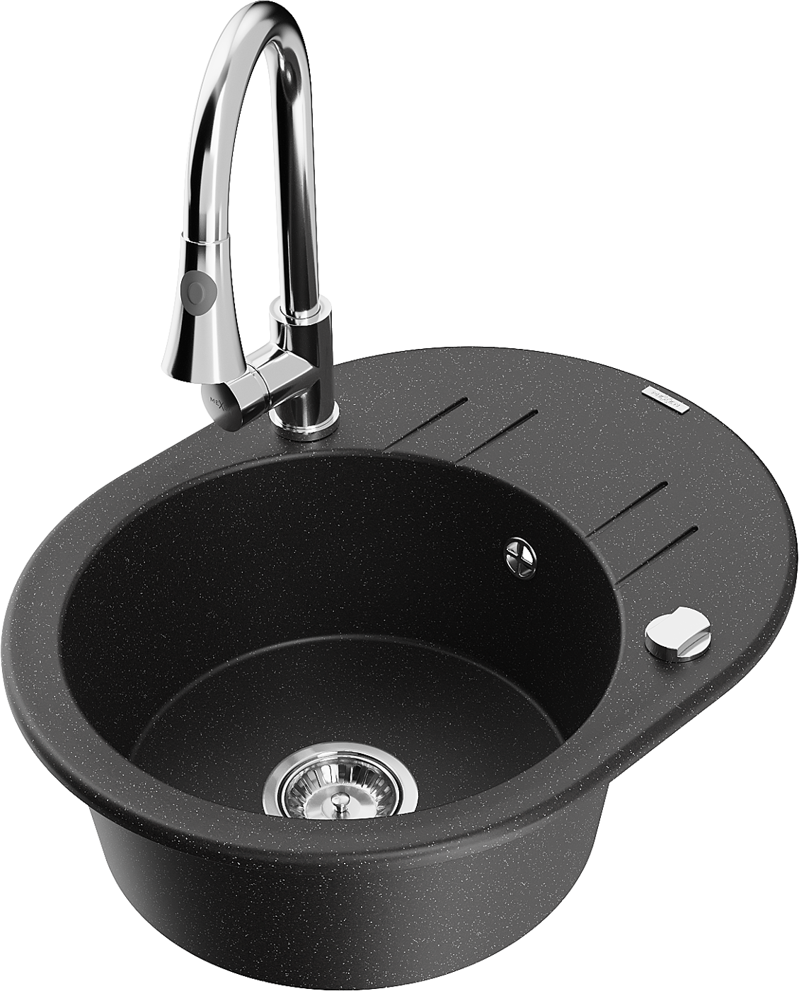 Mexen Kevin granīta izlietne ar vienu nodalījumu, noteku un virtuves jaucējkrānu Elia, melna/sudraba metālika
