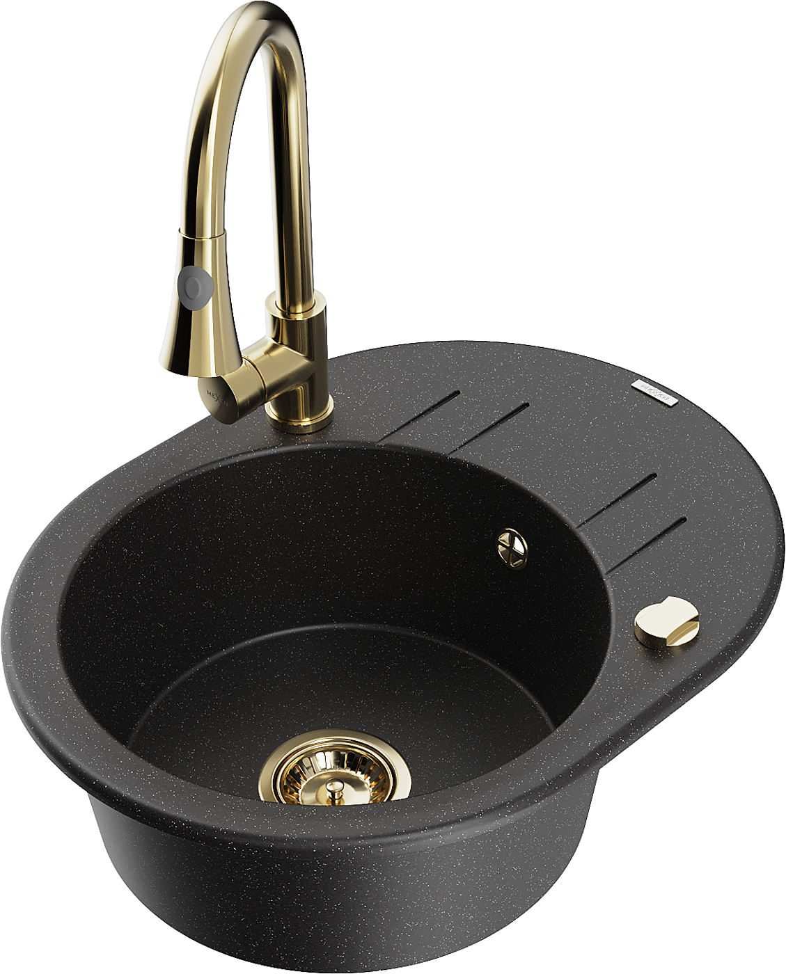 Mexen Kevin vienkameras granīta izlietne ar notekas paneli un virtuvēm krānu Elia, melns/sudraba metāliks - 6517-73-670101-50