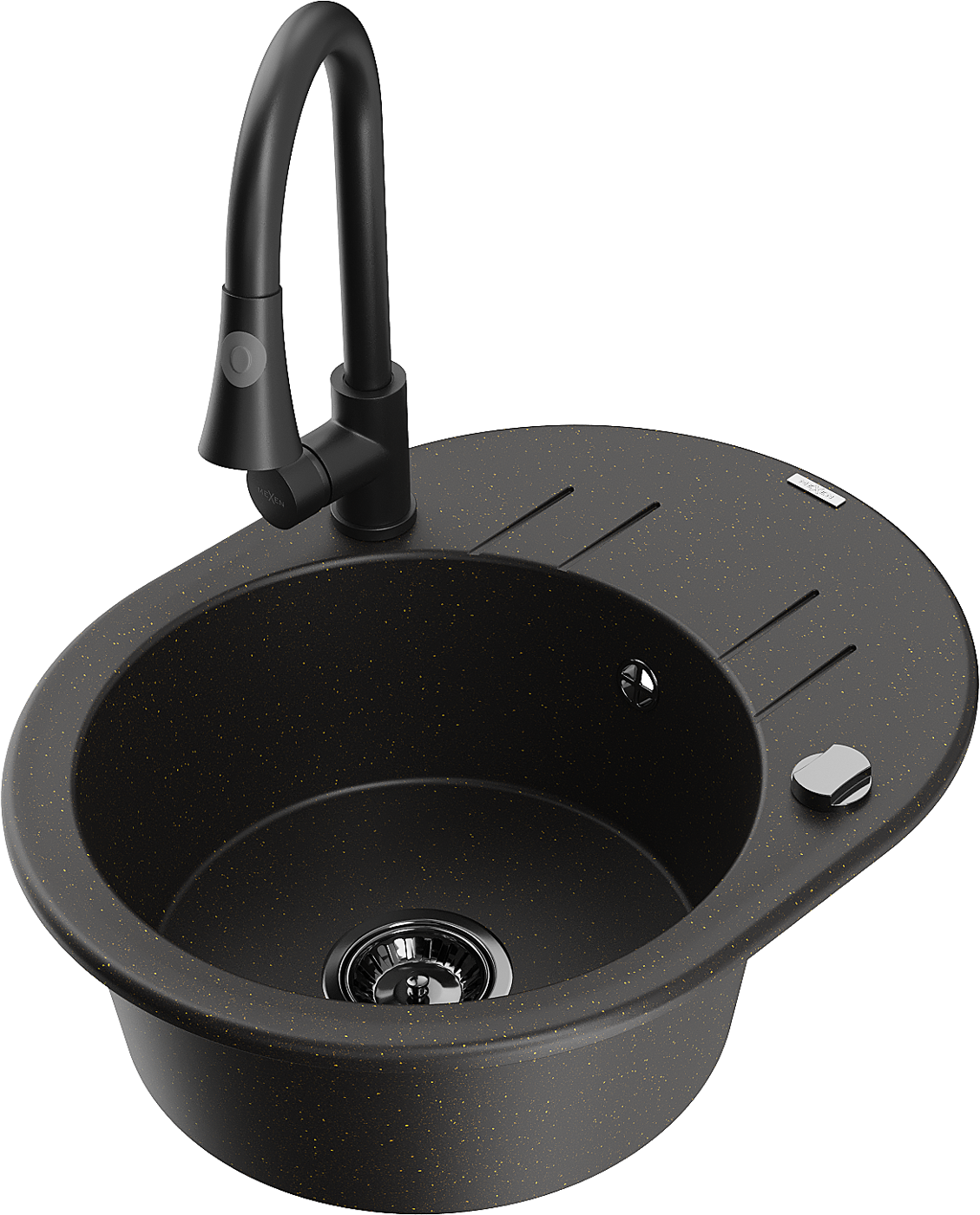 Mexen Kevin granīta izlietne ar vienu nodalījumu, ar noteku un virtuves jaucējkrānu Elia, melna/zelta metālika