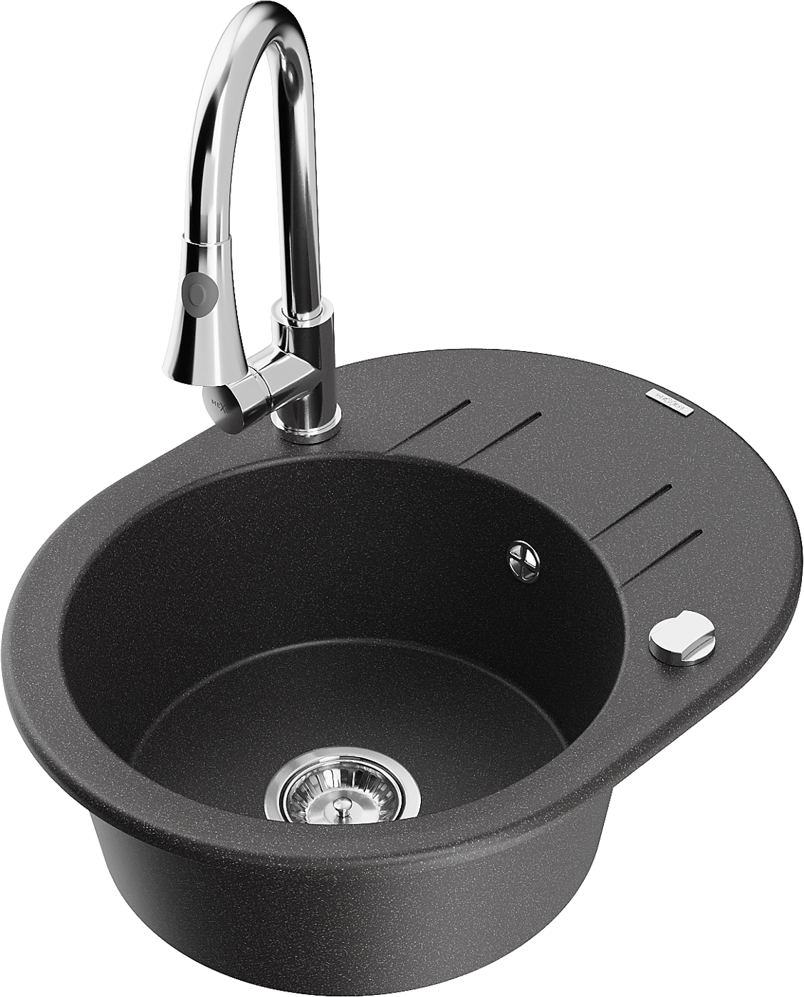 Mexen Kevin granitizlietne ar vienu nodalījumu ar noteces zonu un virtuves jaucējkrānu Elia, melna ar plankumiem