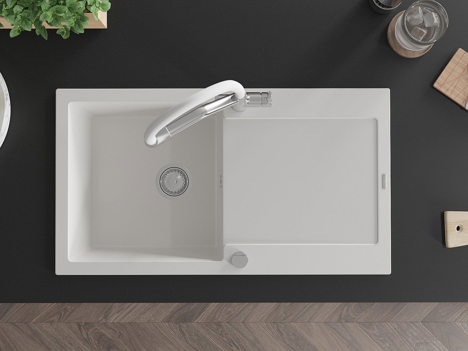 Mexen Leo 1-kameru granīta izlietne ar notecēšanas virsmu un virtuvē jaucējkrāns Duo, balts - 6501-20-671701-02