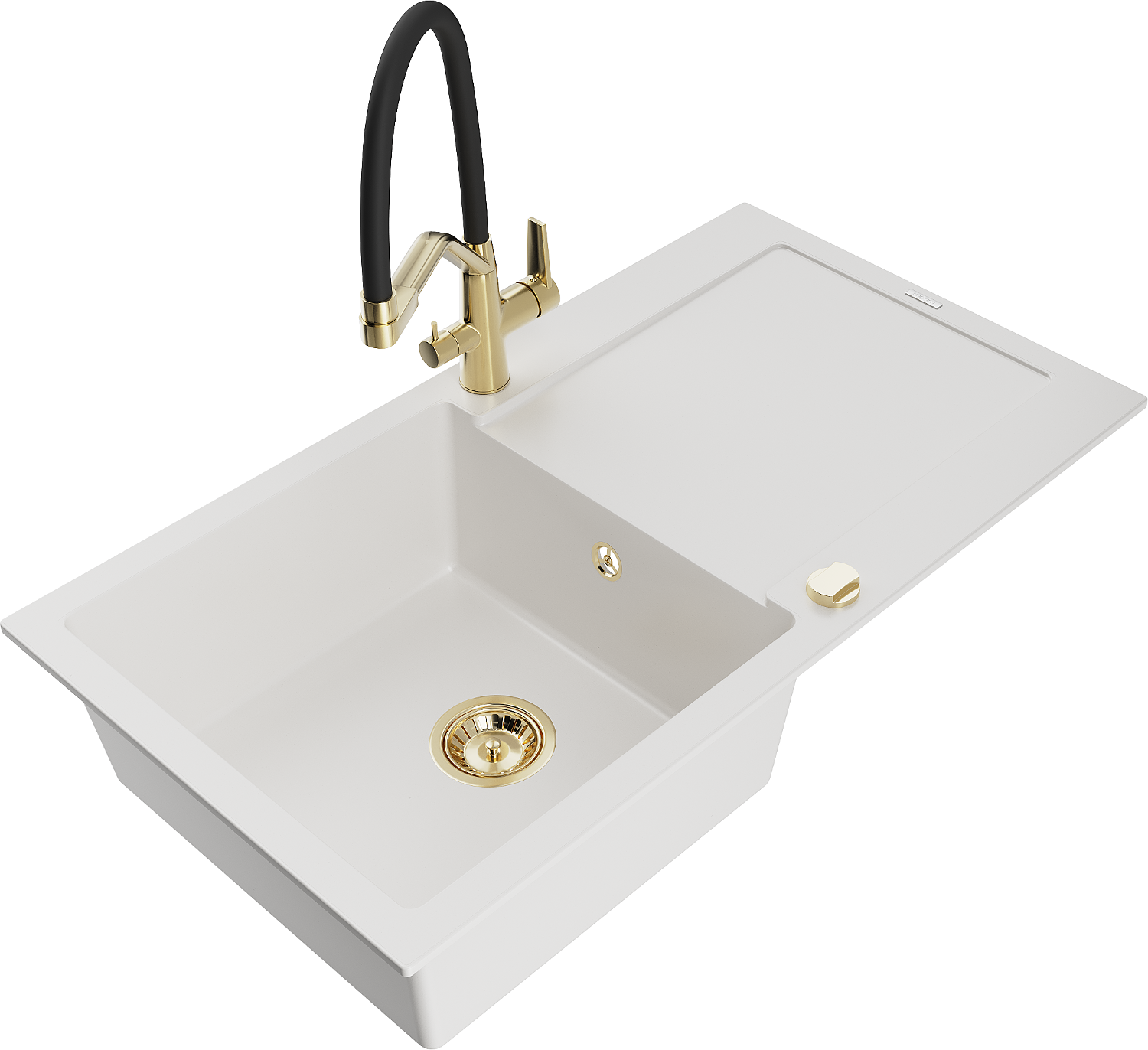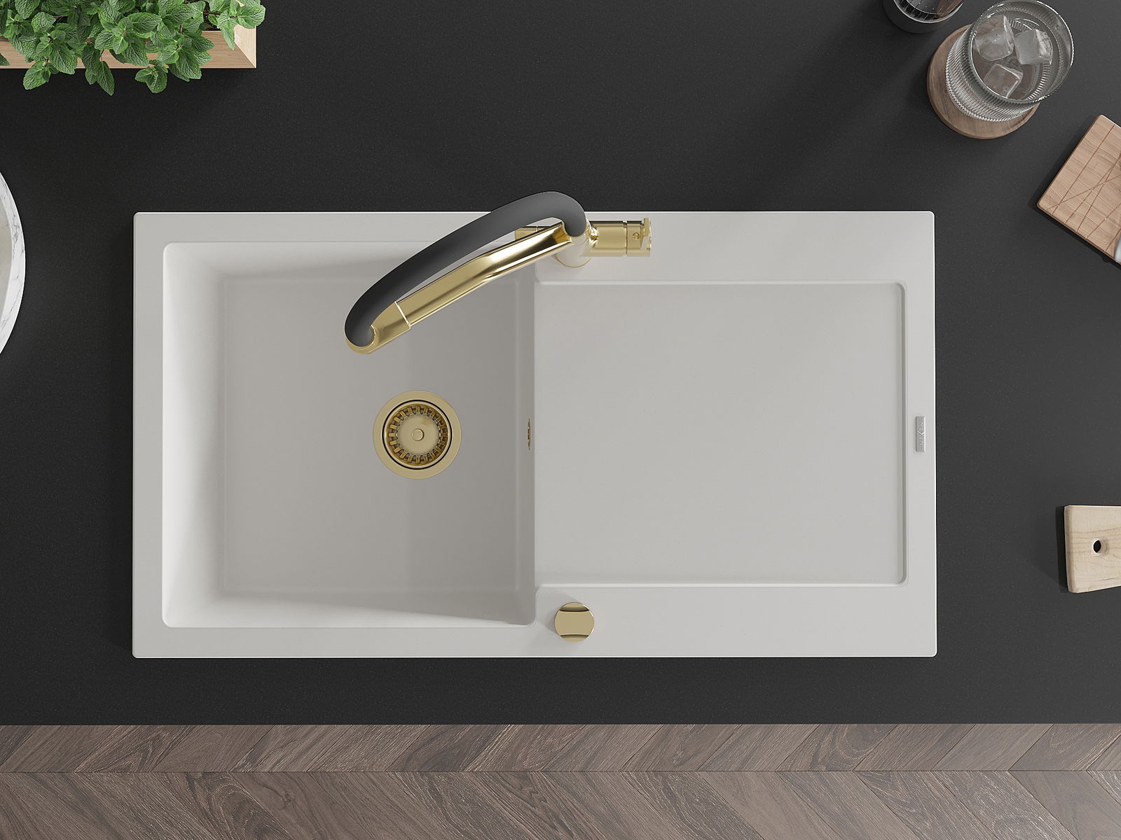 Mexen Leo granit izlietne ar vienu nodalījumu ar noteku un virtuves jaucējkrānu Duo, balts - 6501-20-671701-57-G