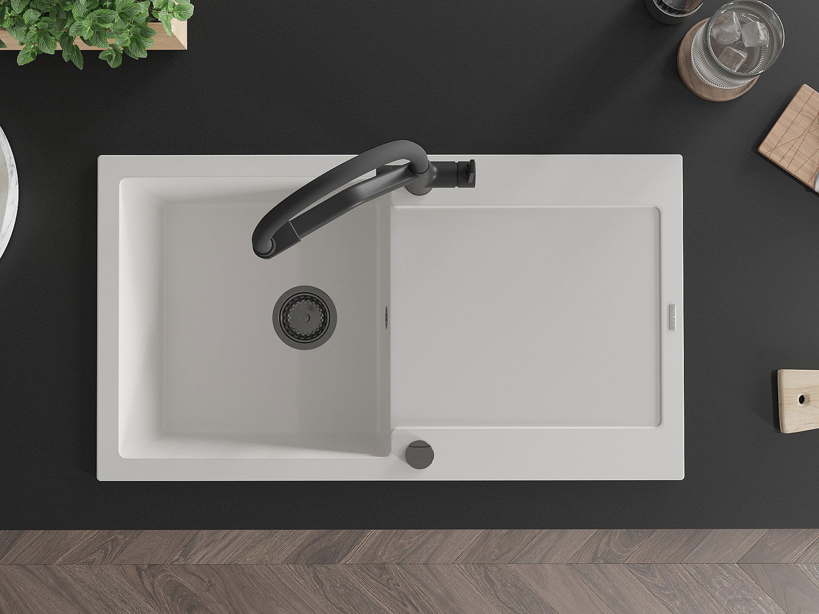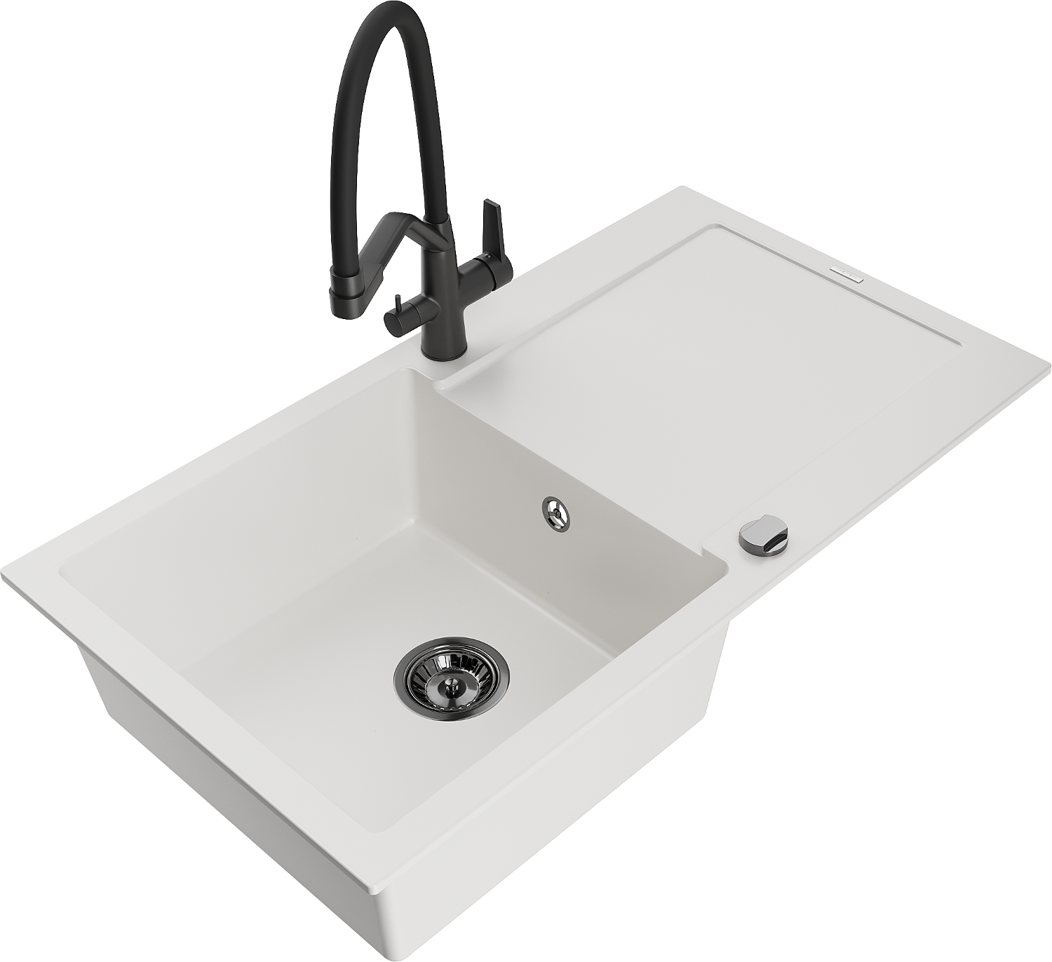 Mexen Leo granīta izlietne ar vienu nodalījumu, noteces paplāti un virtuves jaucējkrānu Duo, balts - 6501-20-671701-70-B