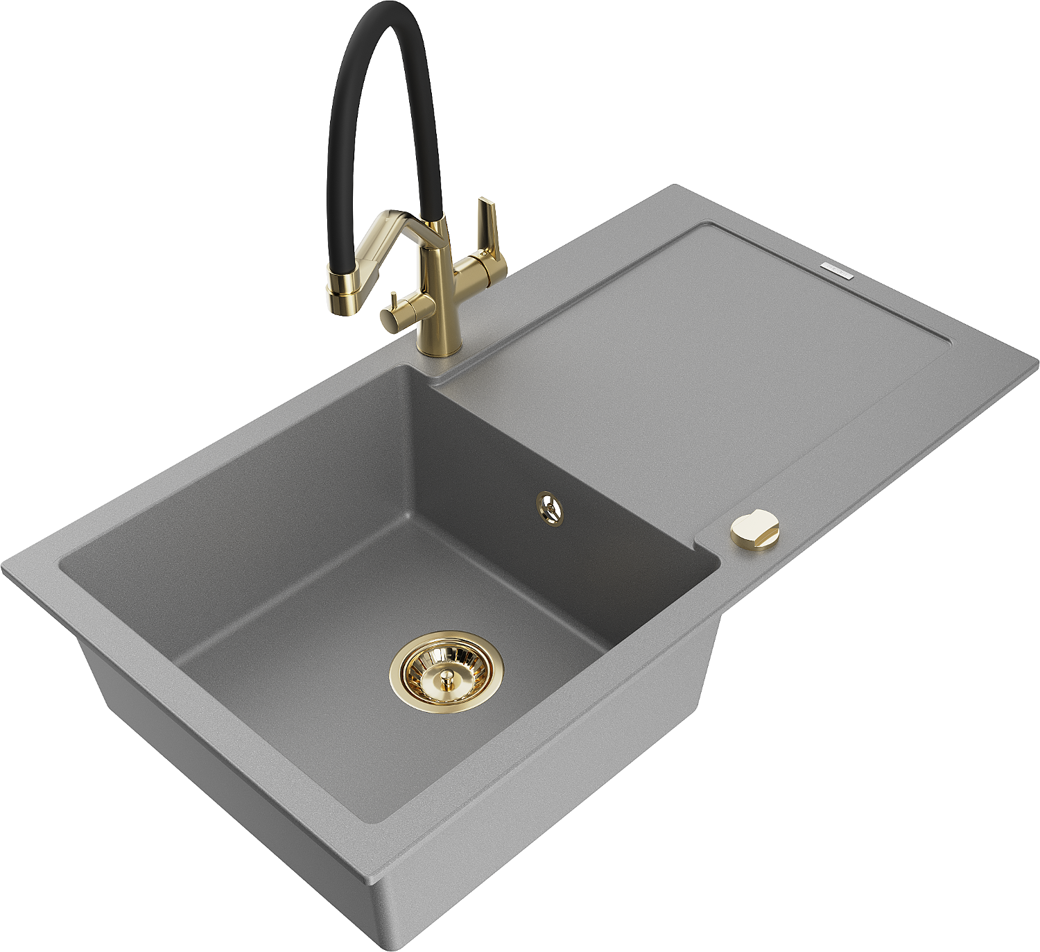 Mexen Leo 1-kameru granīta izlietne ar noteces vietu un virtuves krānu Duo, pelēka - 6501-71-671701-57-G