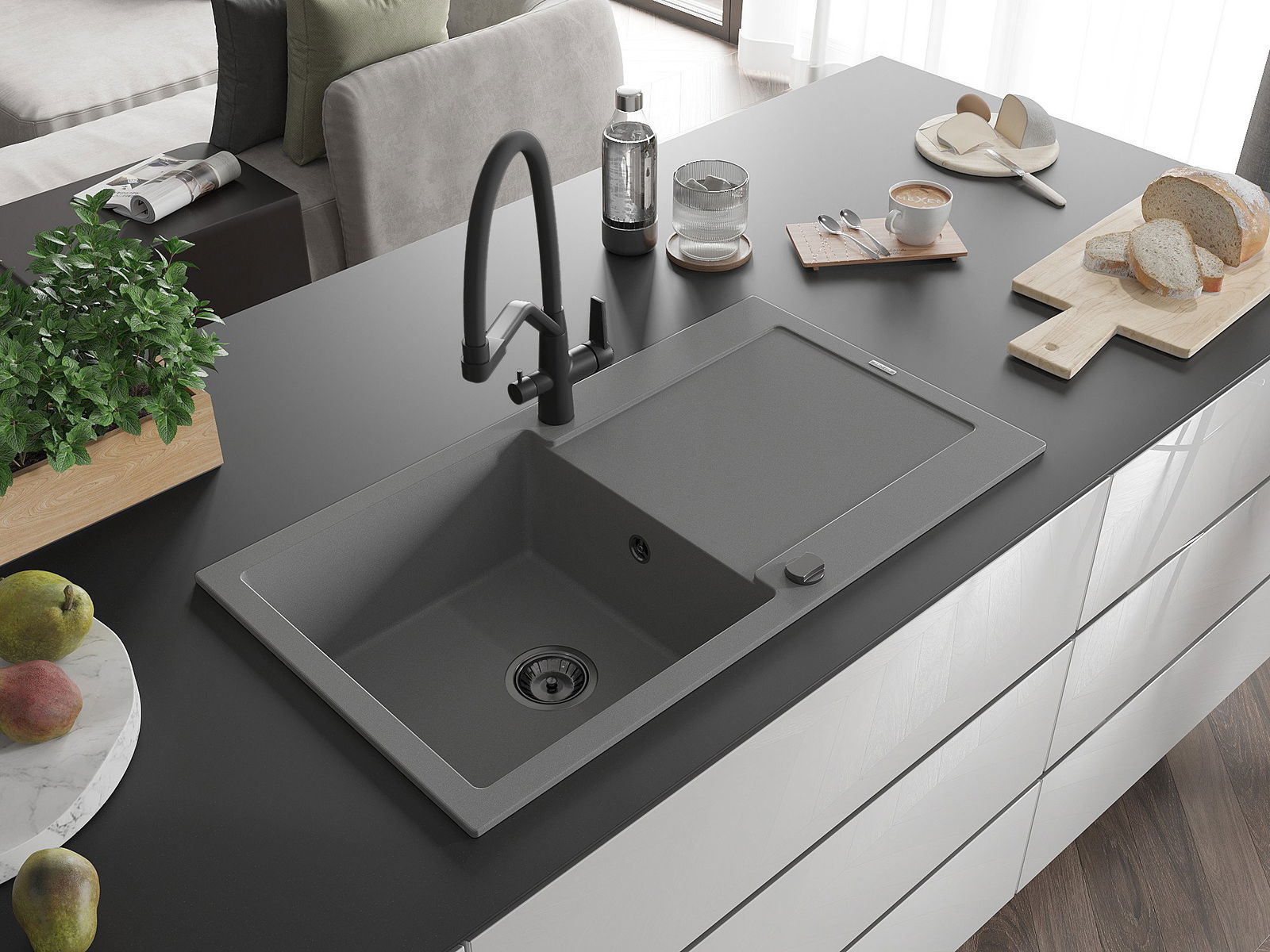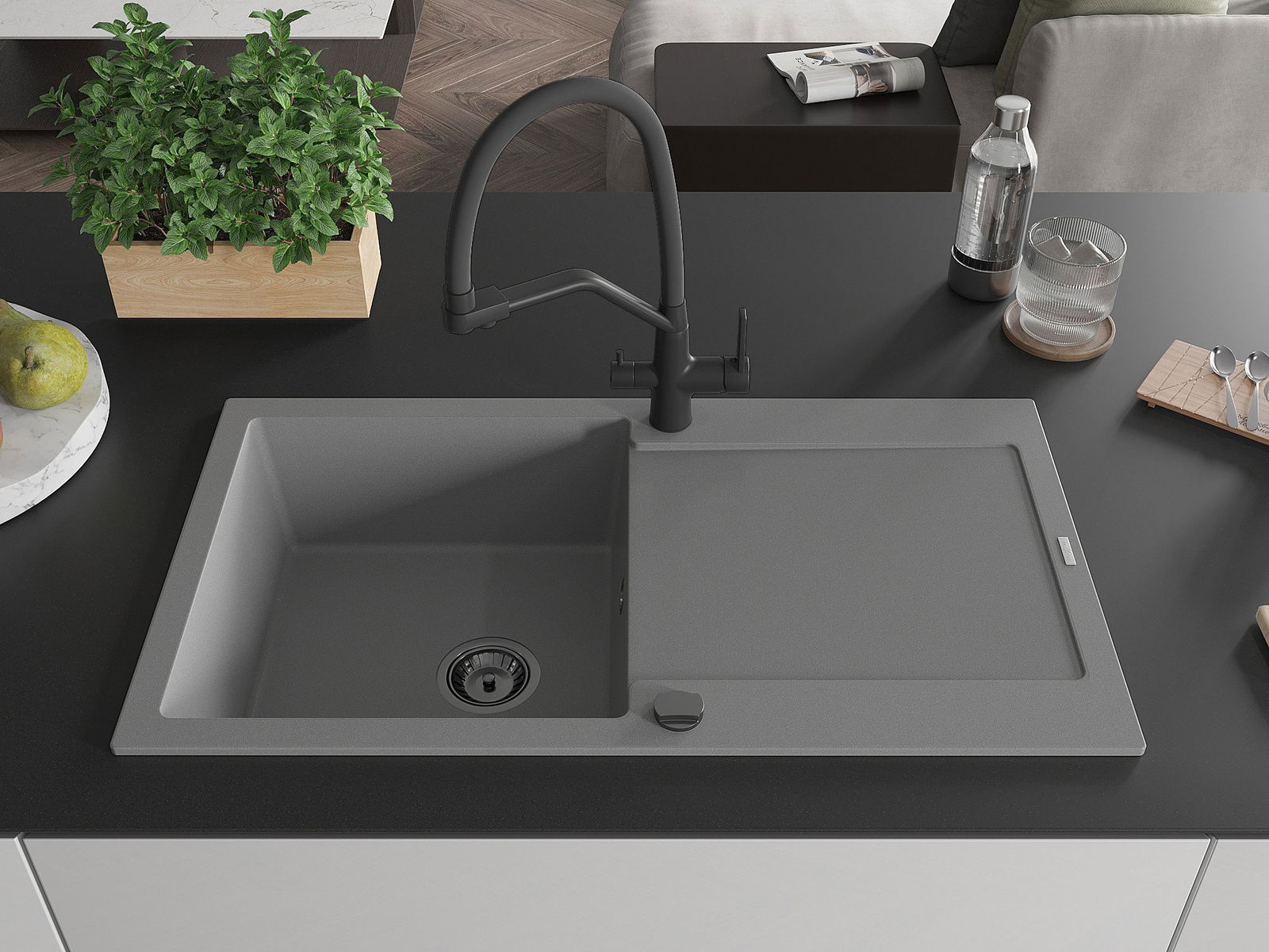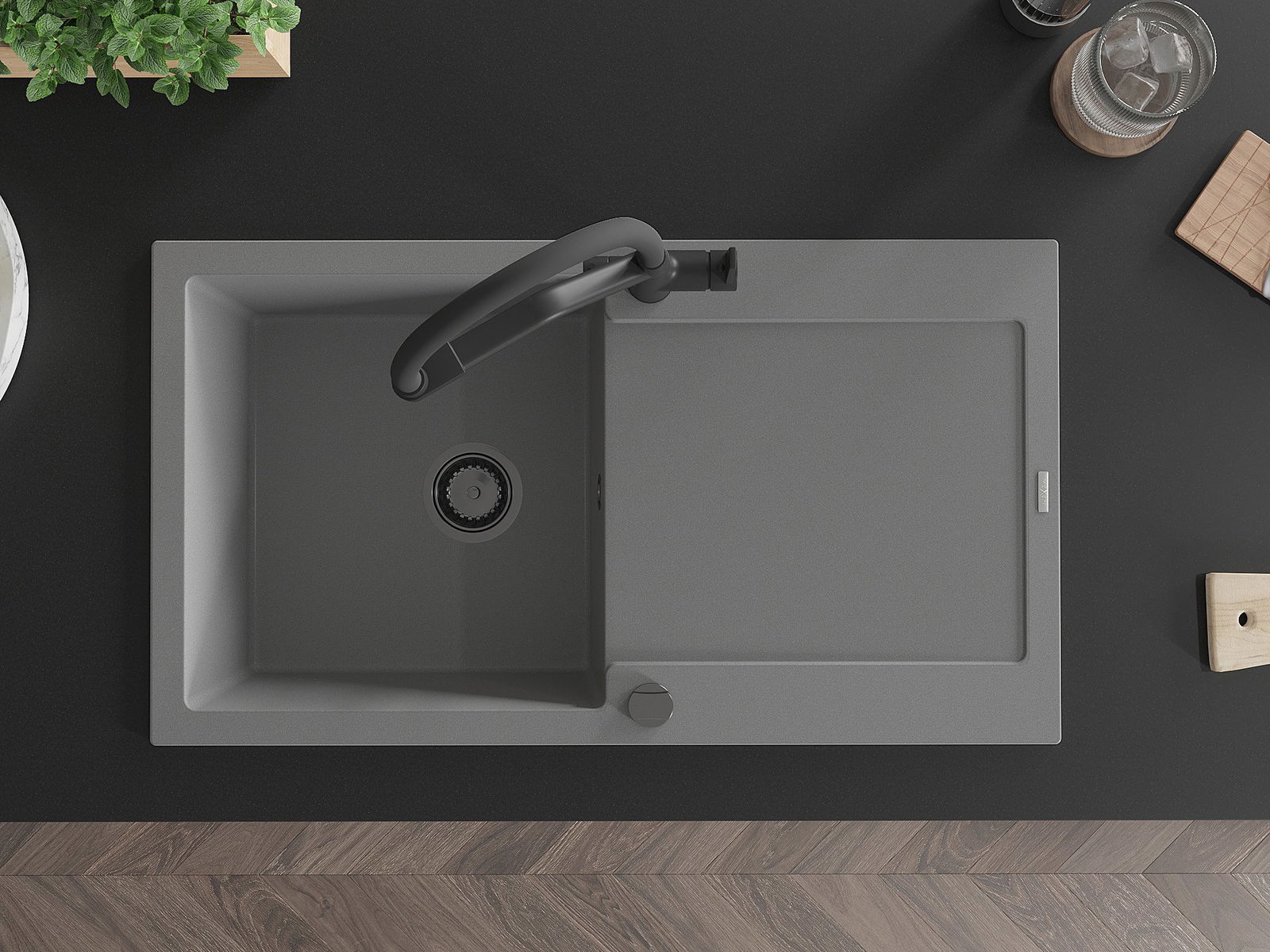 Mexen Leo granitā izlietne ar vienu nodalījumu, notekreni un virtuves maisītāju Duo, pelēka - 6501-71-671701-70-B