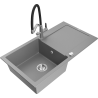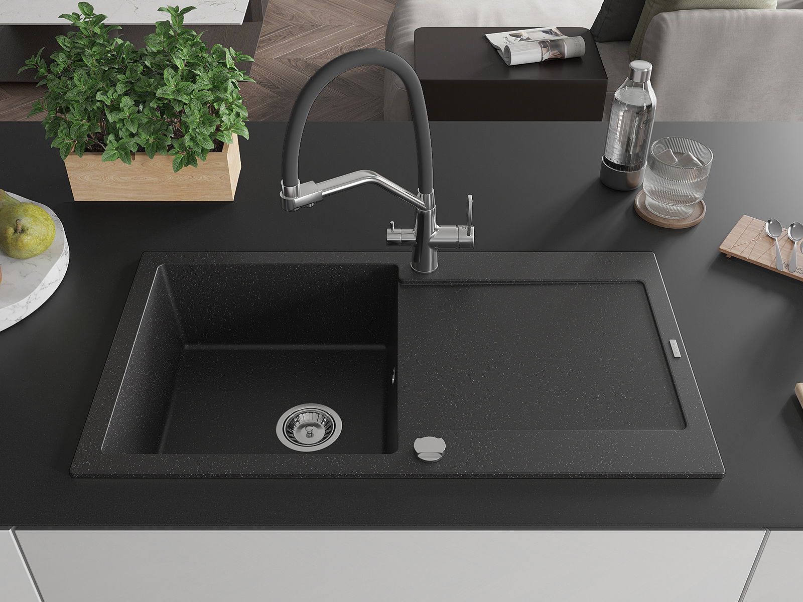 Mexen Leo grānīta izlietne ar vienu nodalījumu, ar žāvētāju un virtuves jaucējkrānu Duo, melns/sudraba metāliks