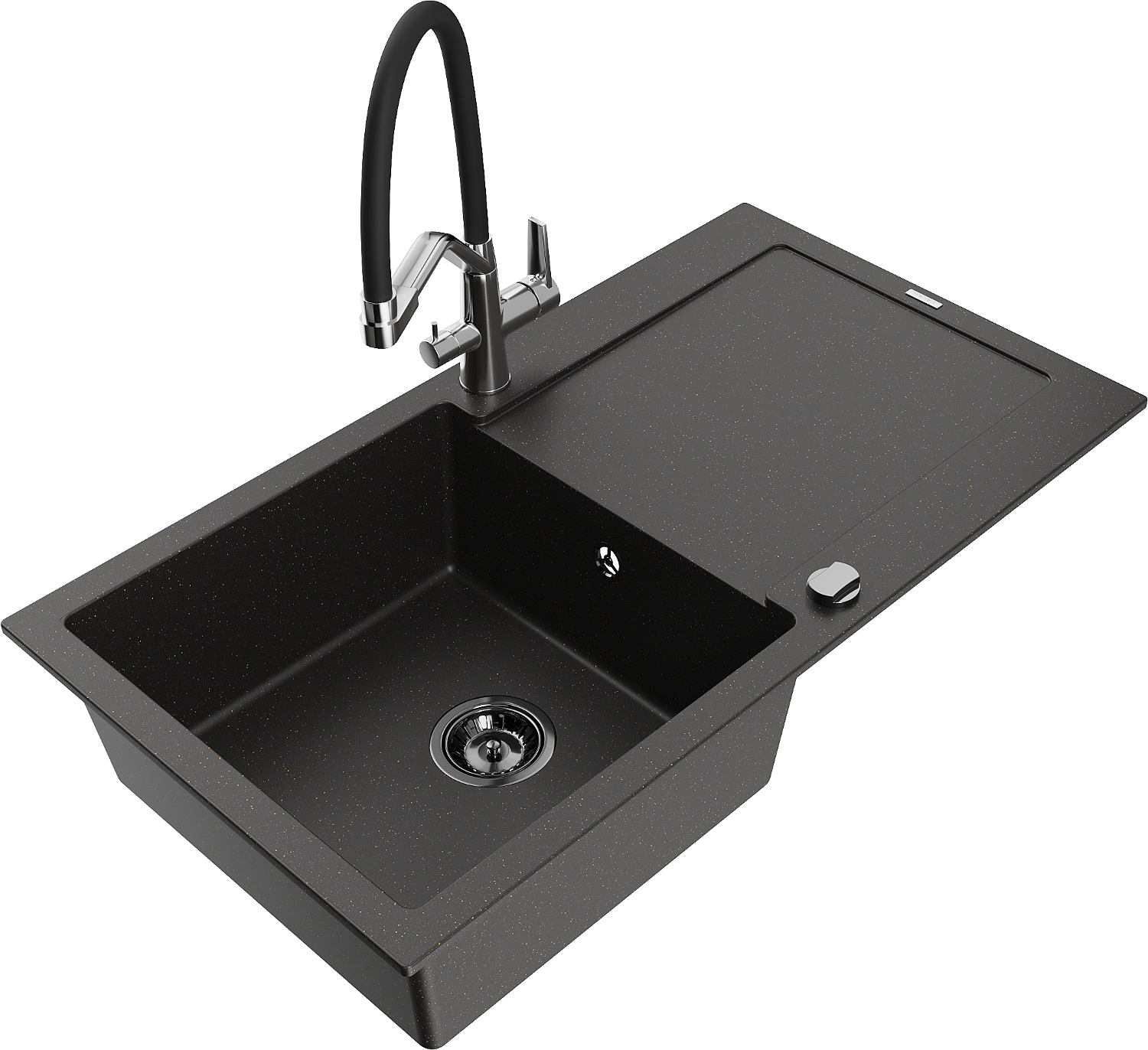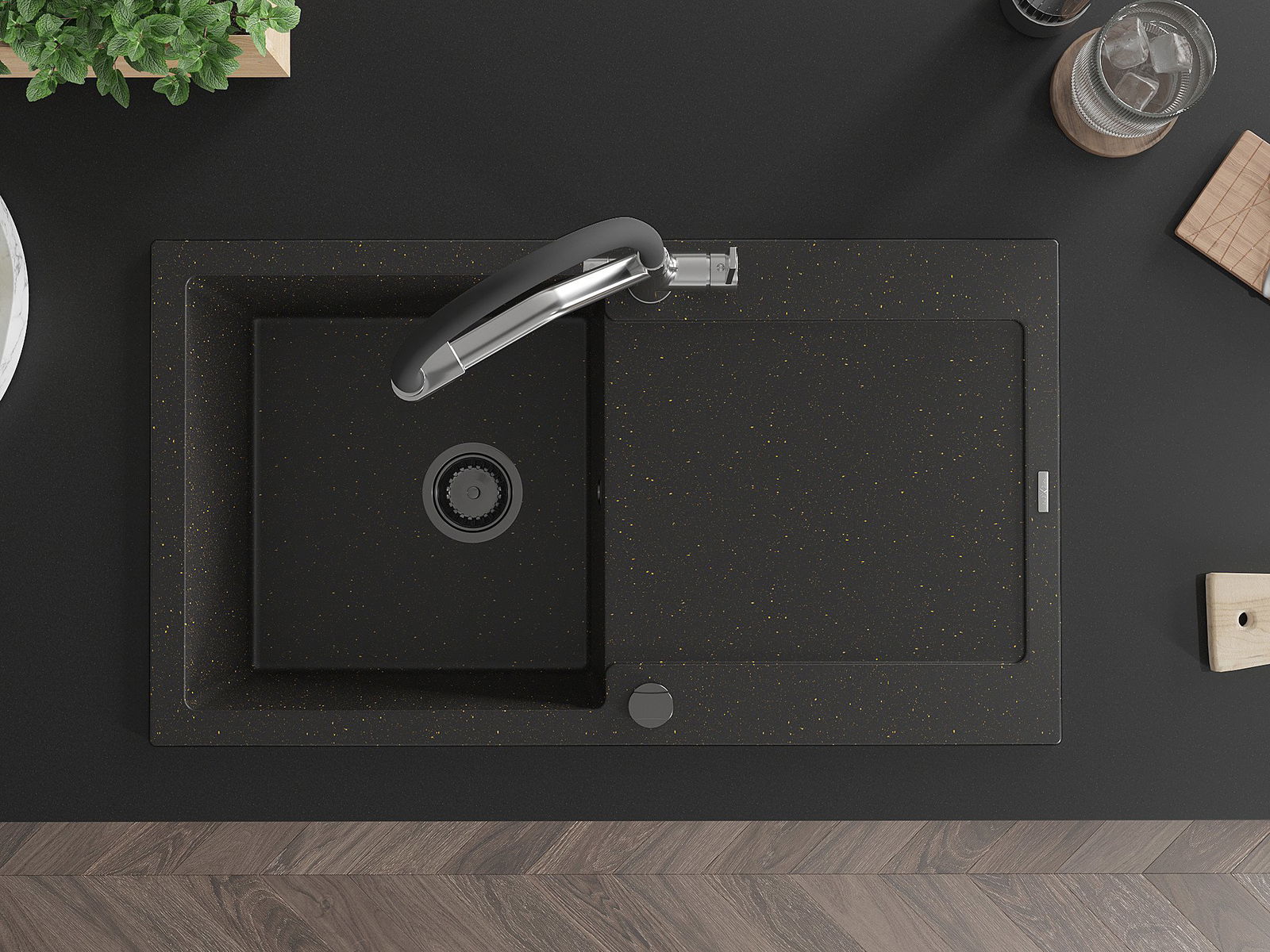 Mexen Leo 1-kameru granīta izlietne ar noteces zonu un virtuves jaucējkrānu Duo, melns/zeltains metāliks - 6501-75-671701-07-B