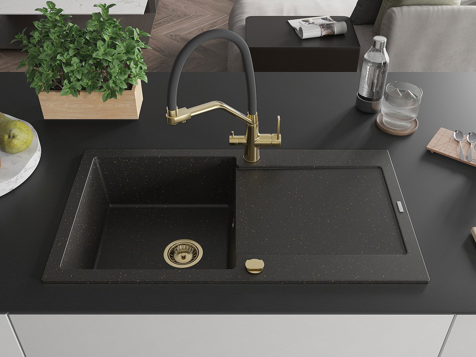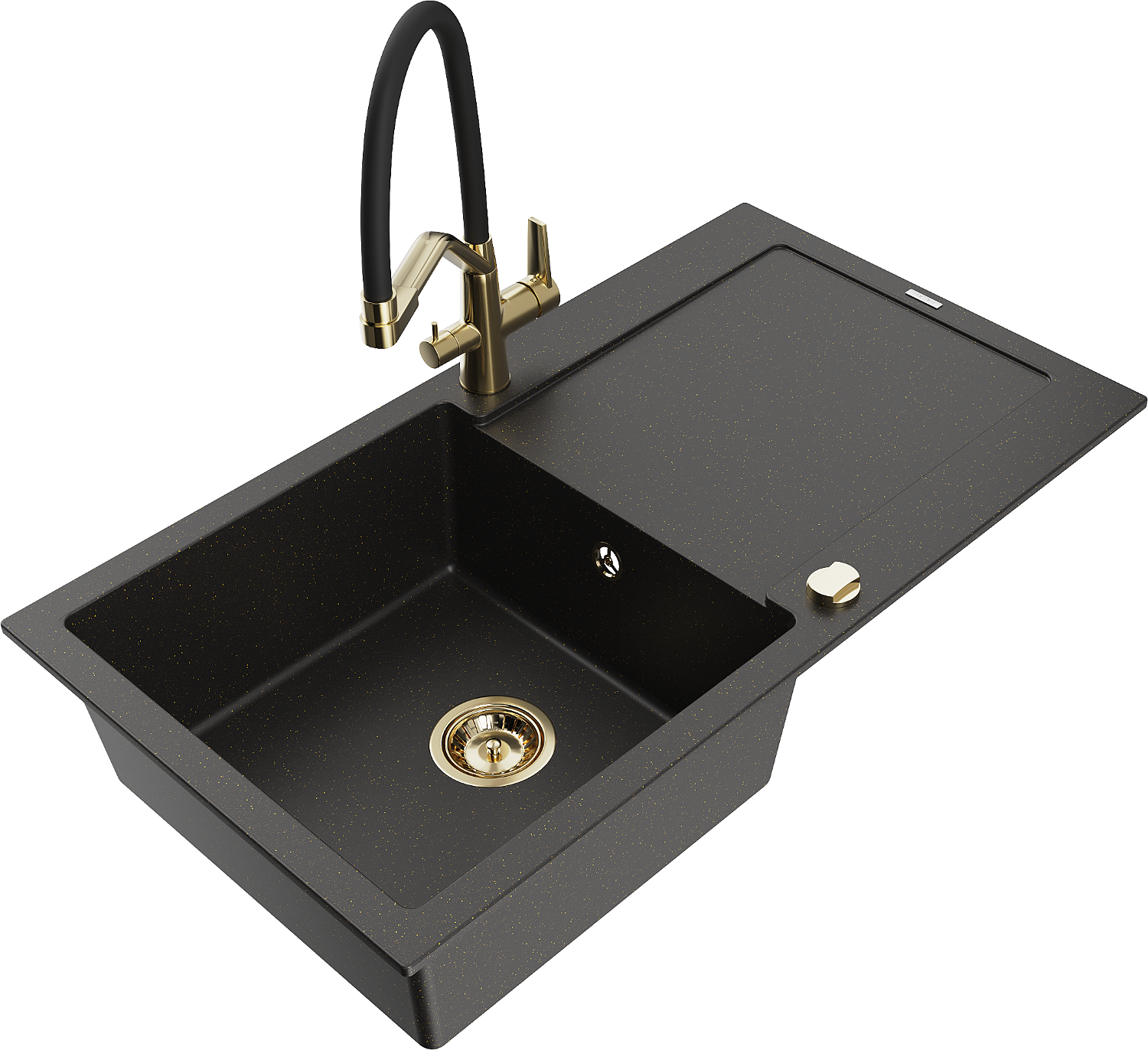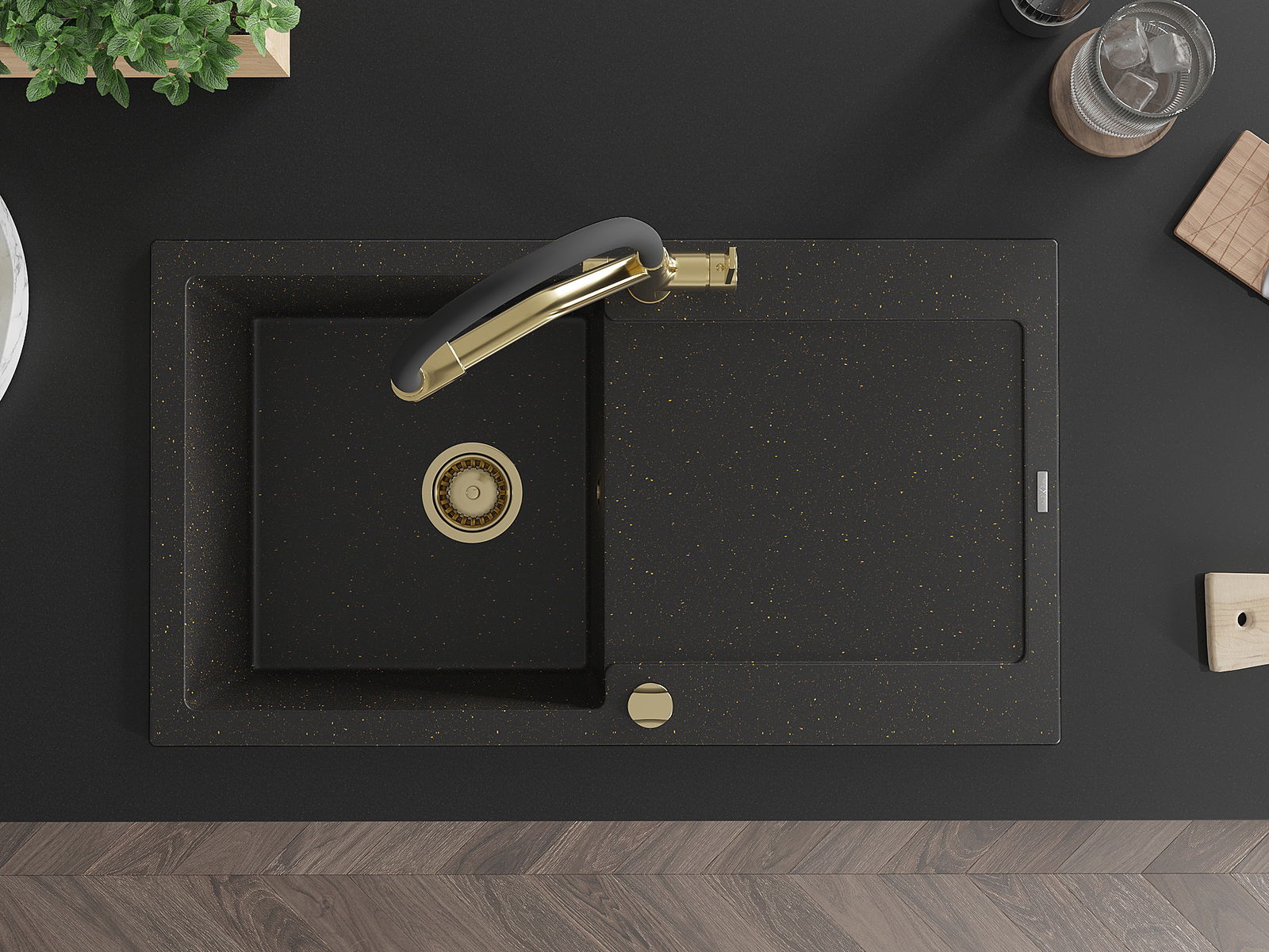 Mexen Leo granit izlietne, 1 nodalījums ar noteku un virtuves jaucējkrānu Duo, melns/zeltains metālisks - 6501-75-671701-57-G