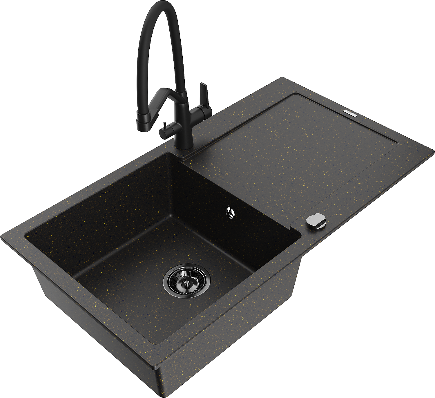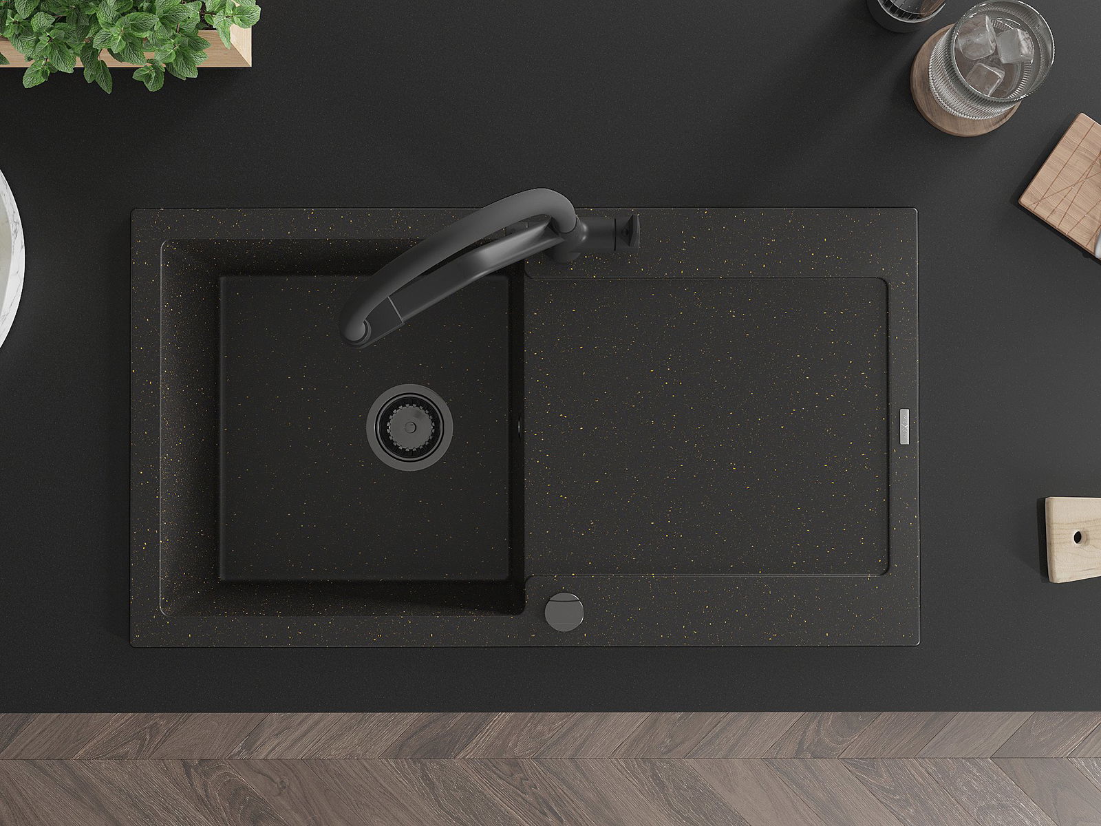 Mexen Leo granitizlietne mazgāšanas izlietne ar vienu nodalījumu, notekplāksni un virtuves jaucējtapu Duo, melns/zelts