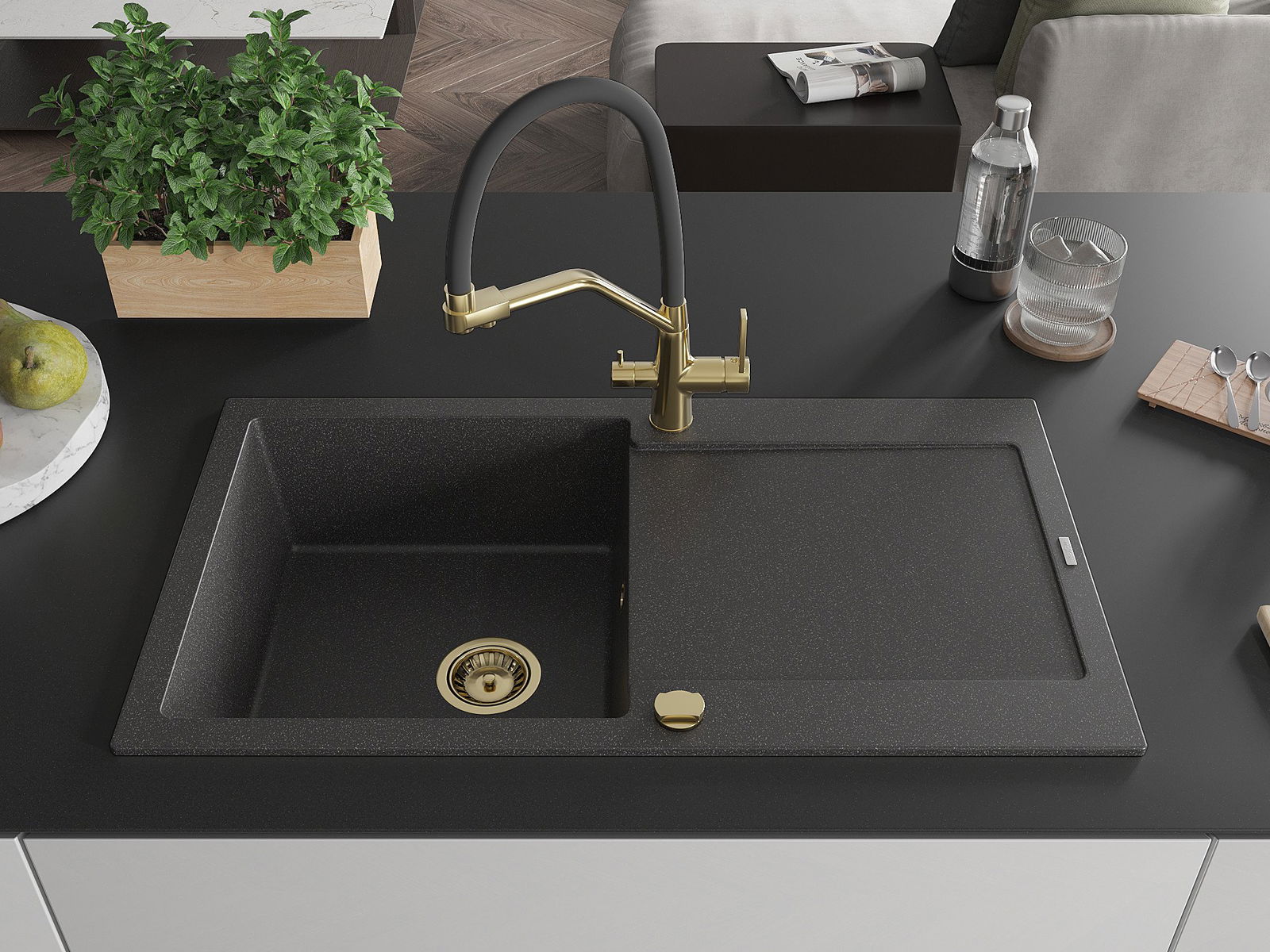 Izlietnei ir 2 daļēji izurbtas atveres ar diametru 35 mm, kuras var pašrocīgi izsist. Tās var izmantot, piemēram, šķidruma dozatora uzstādīšanai, kas novērsīs plastmasas pudeļu klātbūtni virtuvē un piešķirs tai elegantu apdari.
