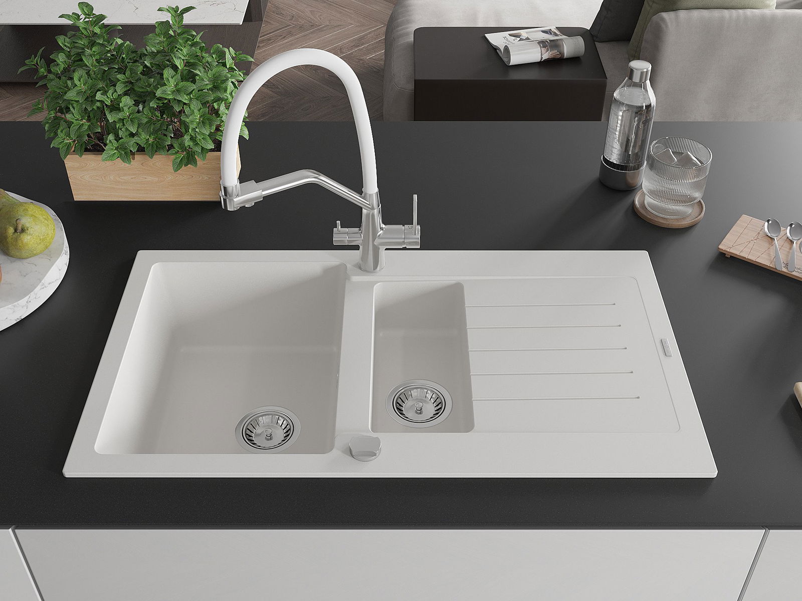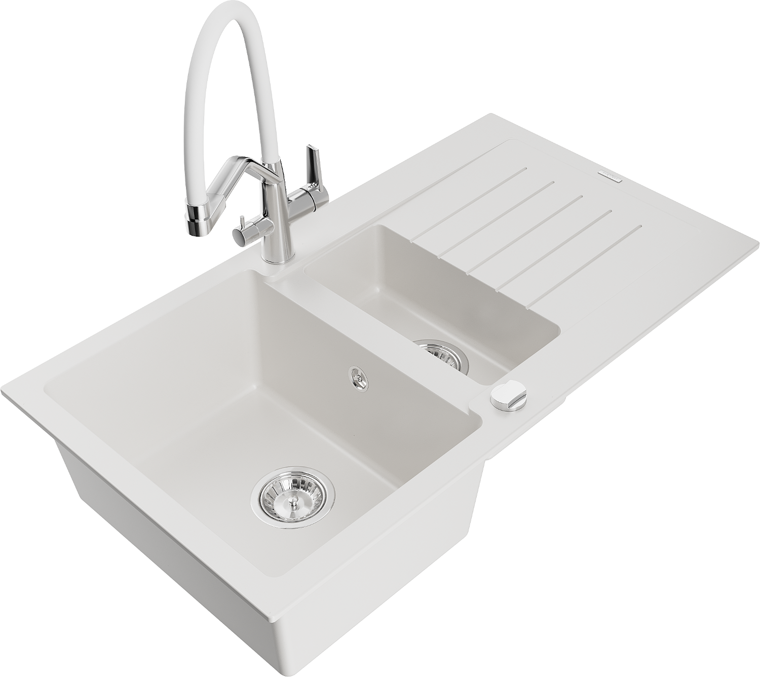 Mexen Matias 1,5 kameru granīta izlietne ar noteci un virtuves jaucējkrānu Duo, balts - 6502-20-671701-02
