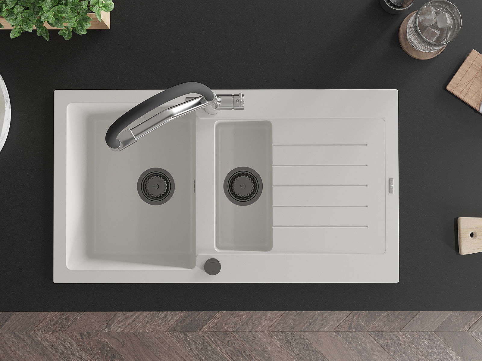 Mexen Matias 1,5 nodalījuma granīta izlietne ar noteces kārtu un virtuves jaucējkrānu Duo, balts - 6502-20-671701-07-B