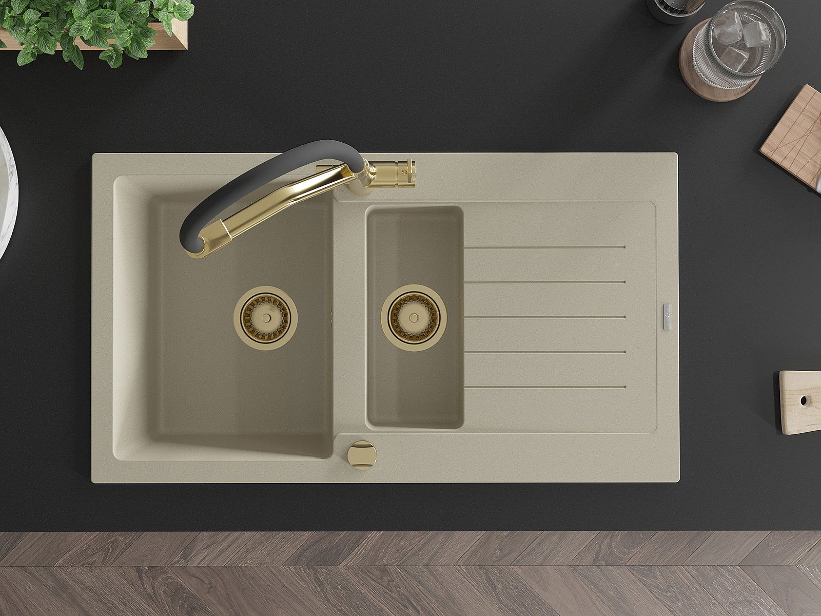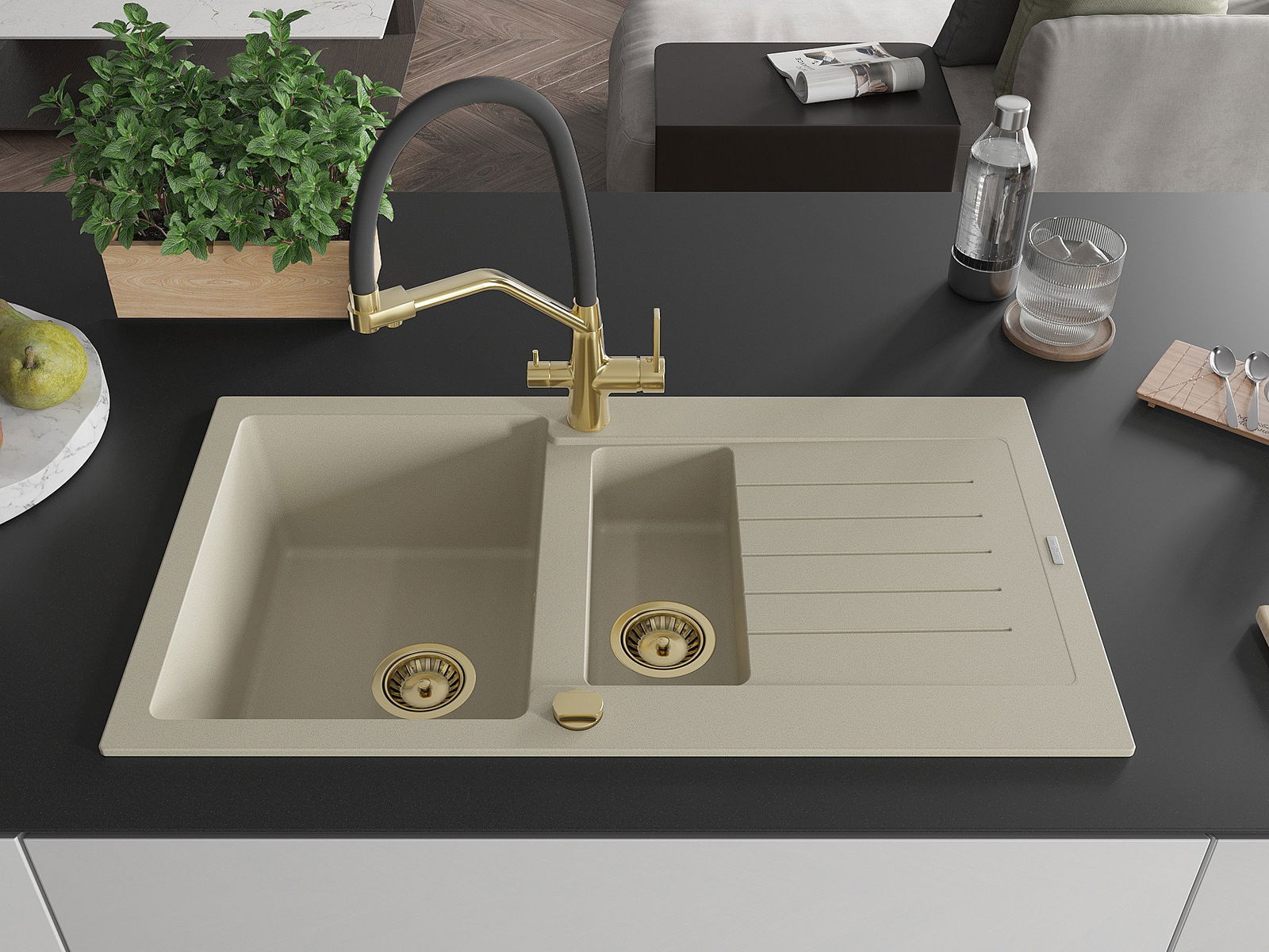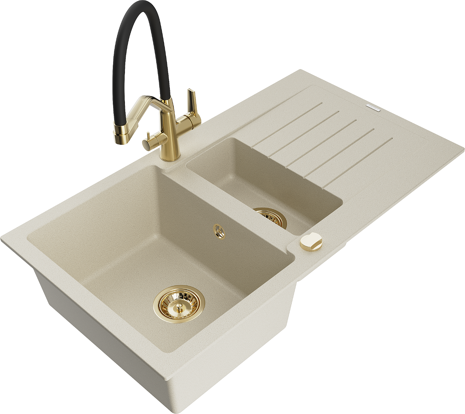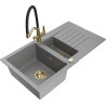 Mexen Matias 1,5 nodalījuma granīta izlietne ar pilienu un virtuves jaucējkrānu Duo, bēša - 6502-69-671701-57-G