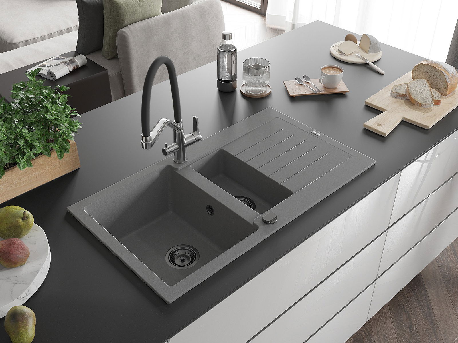 Mexen Matias granitizlietne mazgājamo baseinu 1,5 kambaru ar noteku un virtuves jaucējkrānu Duo, pelēks - 6502-71-671701-07-B