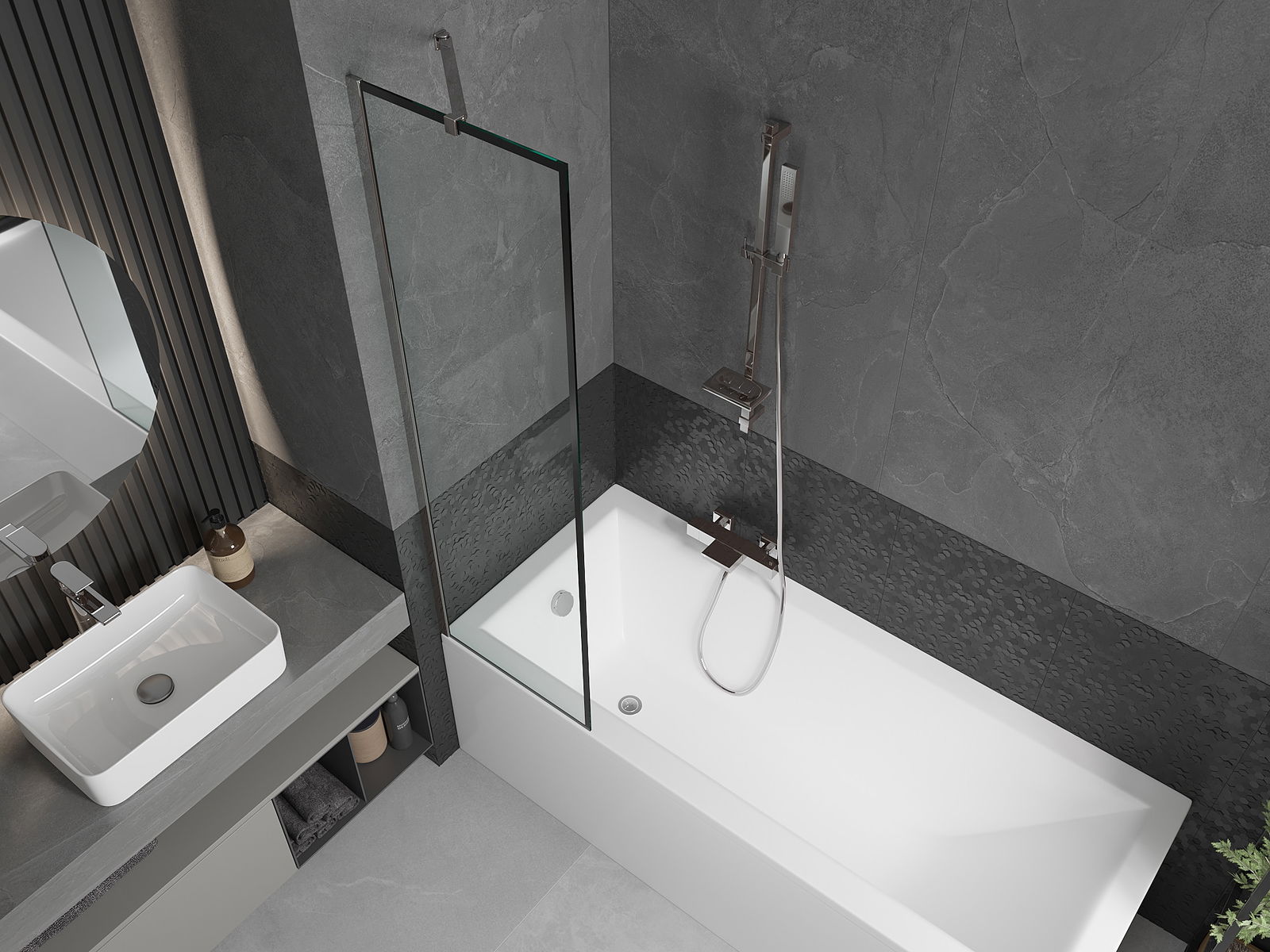 Efektīva aizsardzība pret ūdens izšļakstīšanos peldēšanās laikā. Ekrānam ir blīves, kas ideāli pielāgojas stikla virsmai un vannas malai. Funkcionāls risinājums, kas nodrošina drošību un vieglu tīrību.