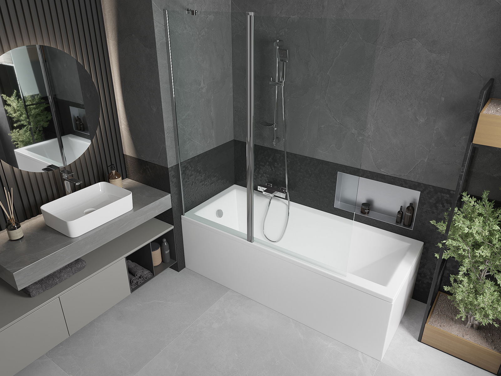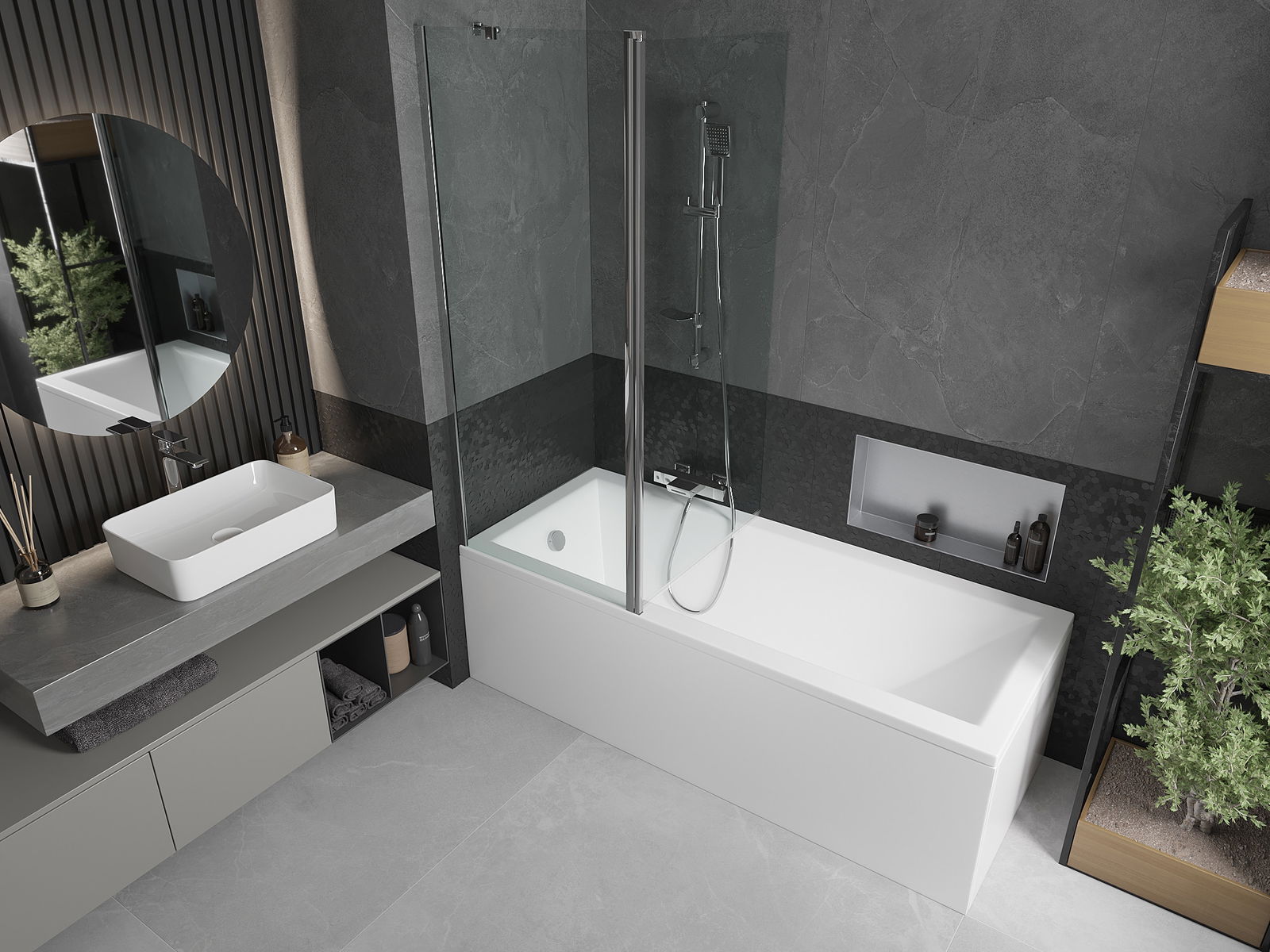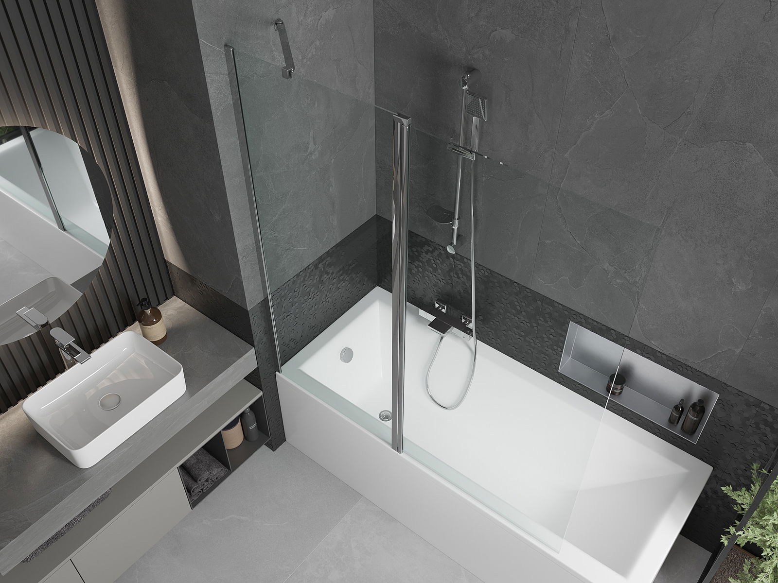 Efektīva aizsardzība pret ūdens izšļakstīšanos peldēšanās laikā. Ekrānam ir blīves, kas ideāli pielāgojas stikla virsmai un vannas malai. Funkcionāls risinājums, kas nodrošina drošību un vieglu tīrību.
