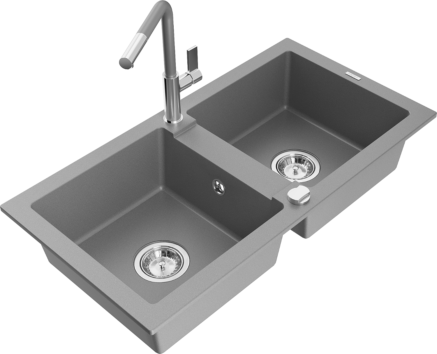 Mexen Mario divpadsmit granīta izlietne ar 2 nodalījumiem un virtuves jaucējkrānu Flora, pelēka - 6504-71-670401-06