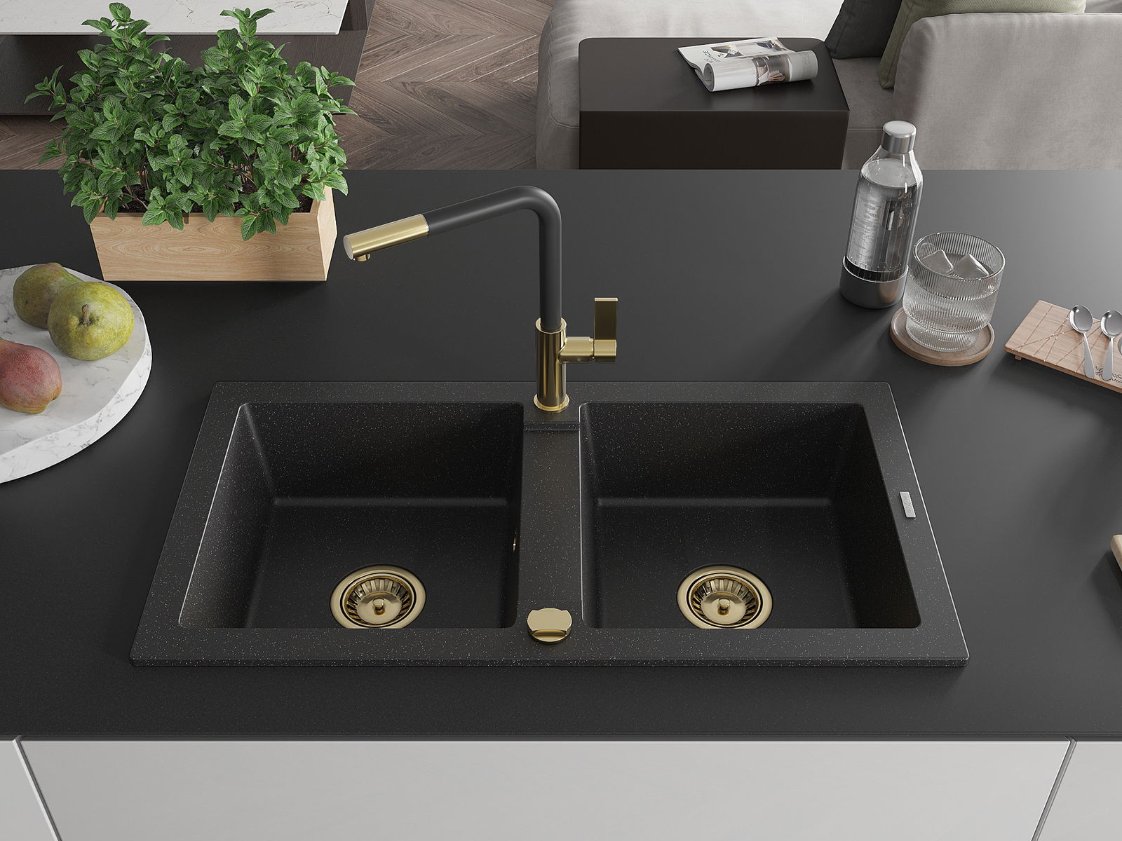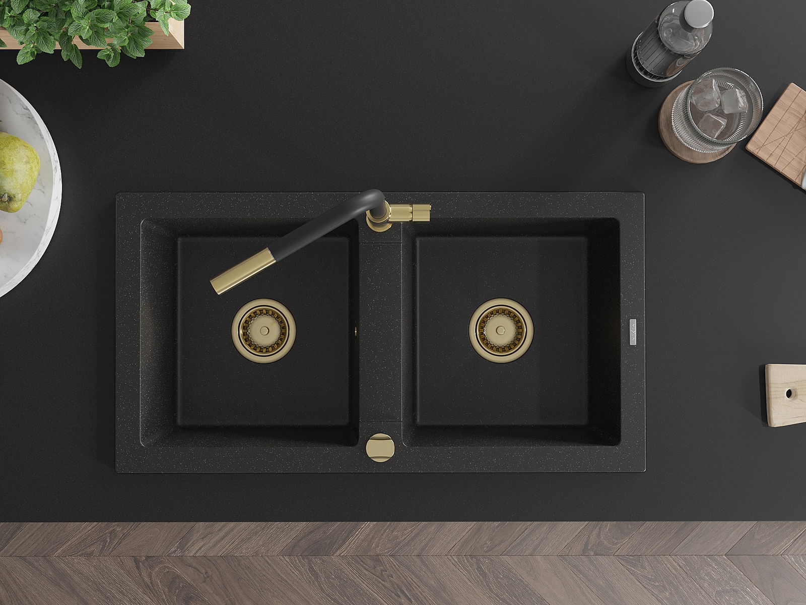 Mexen Mario granitā izlietne ar divām kamerām un virtuves jaucējkrānu Flora, melnā/sudraba metālikā - 6504-73-670401-57-G