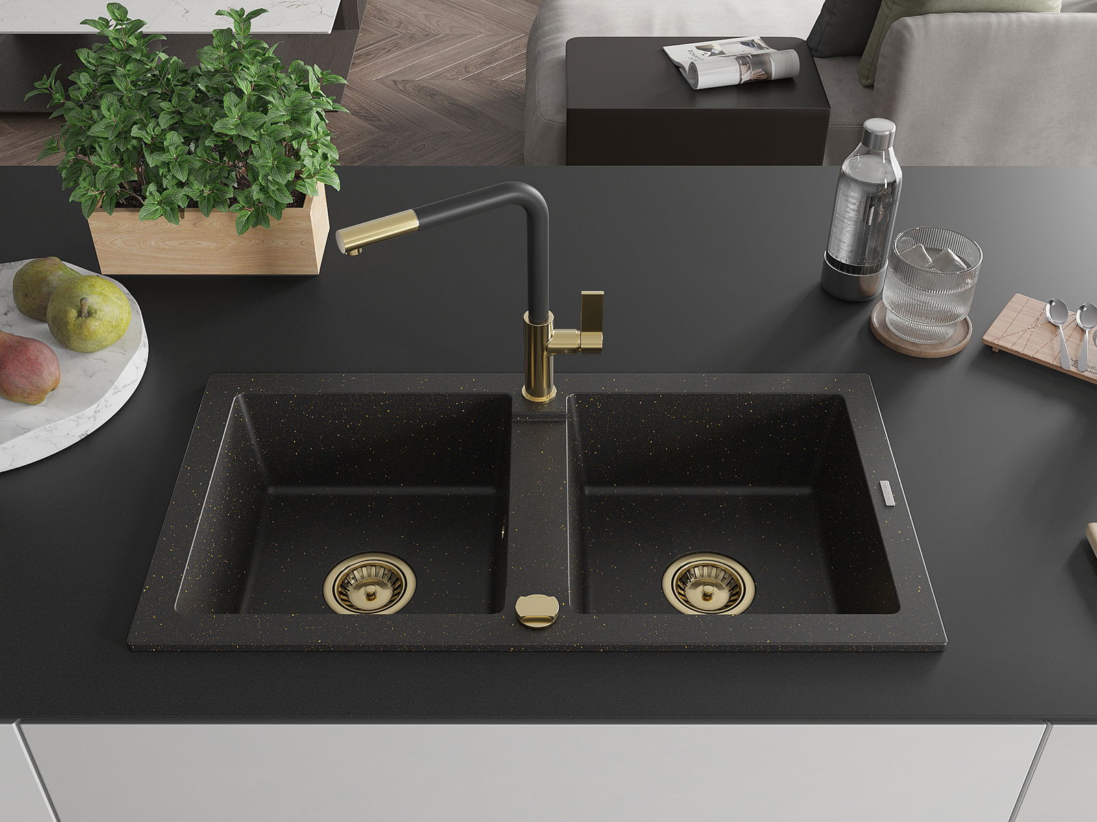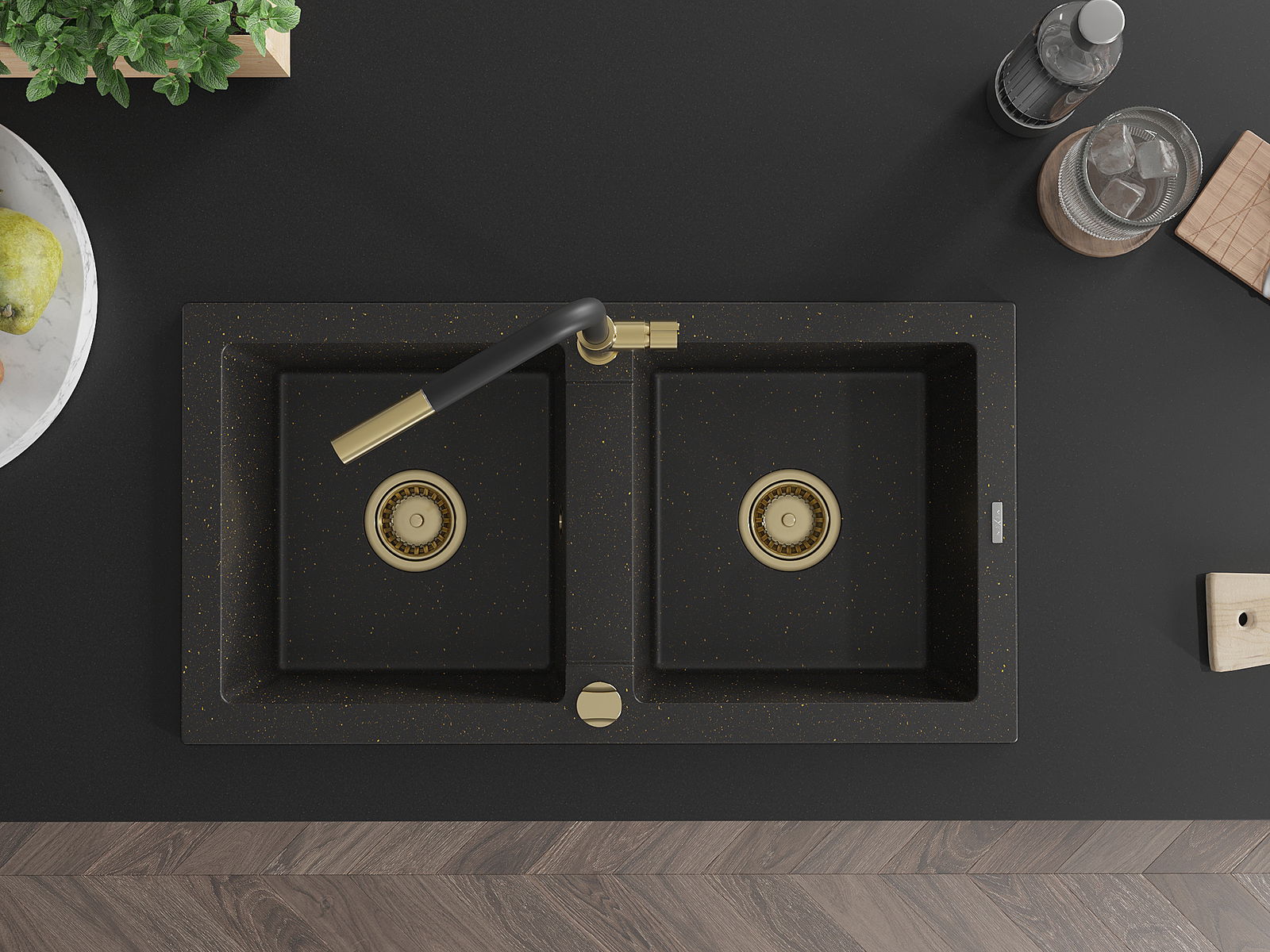 Mexen Mario granit izlietne ar 2 nodalījumiem un virtuves jaucējkrānu Flora, melna/zeltīta - 6504-75-670401-57-G