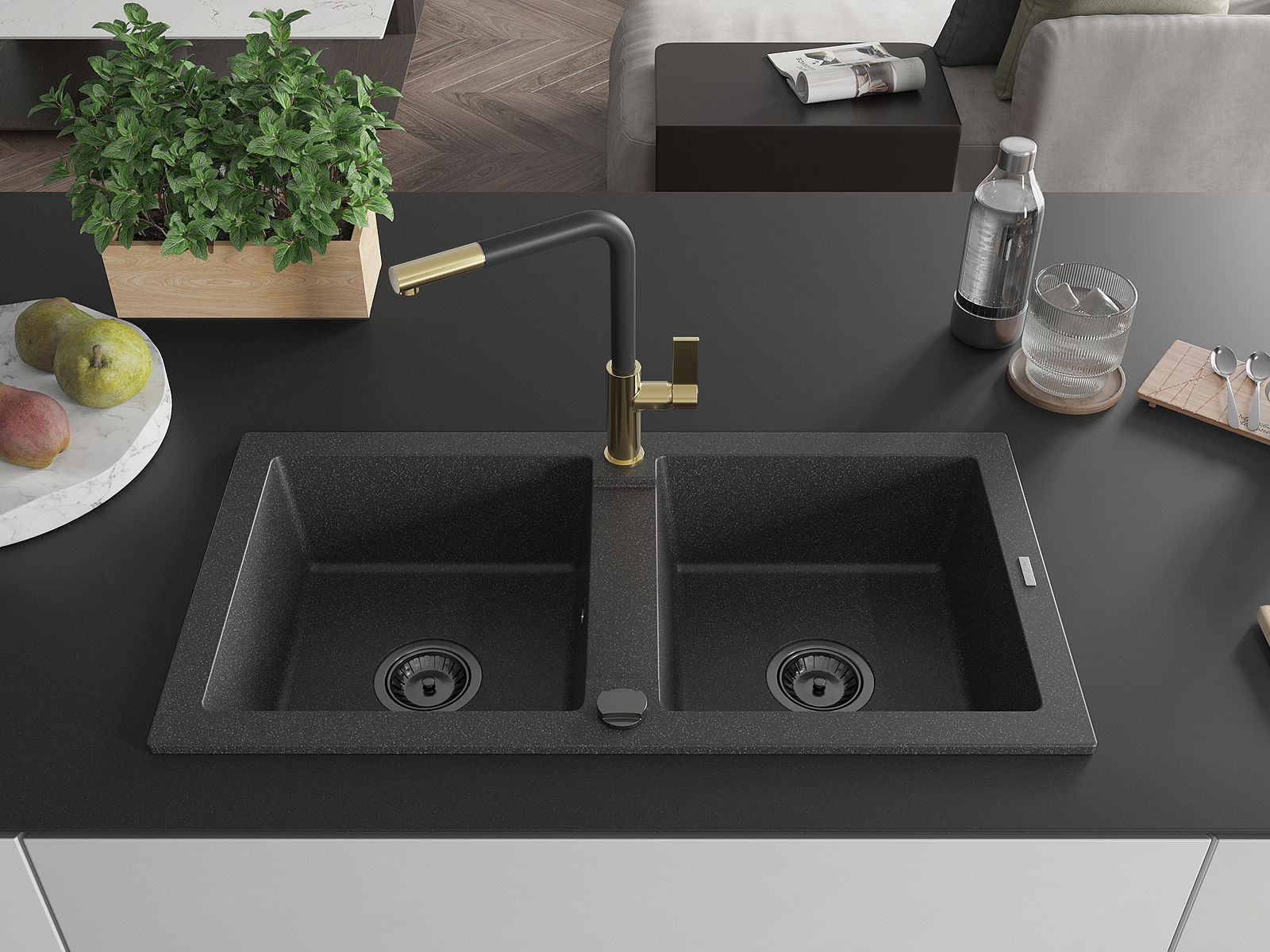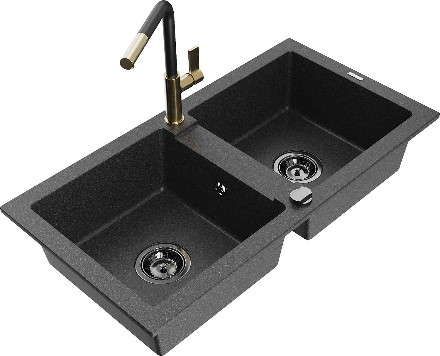 Mexen Mario granīta izlietne ar 2 nodalījumiem un virtuves jaucējkrānu Flora, melna ar punktiem - 6504-76-670401-57-B