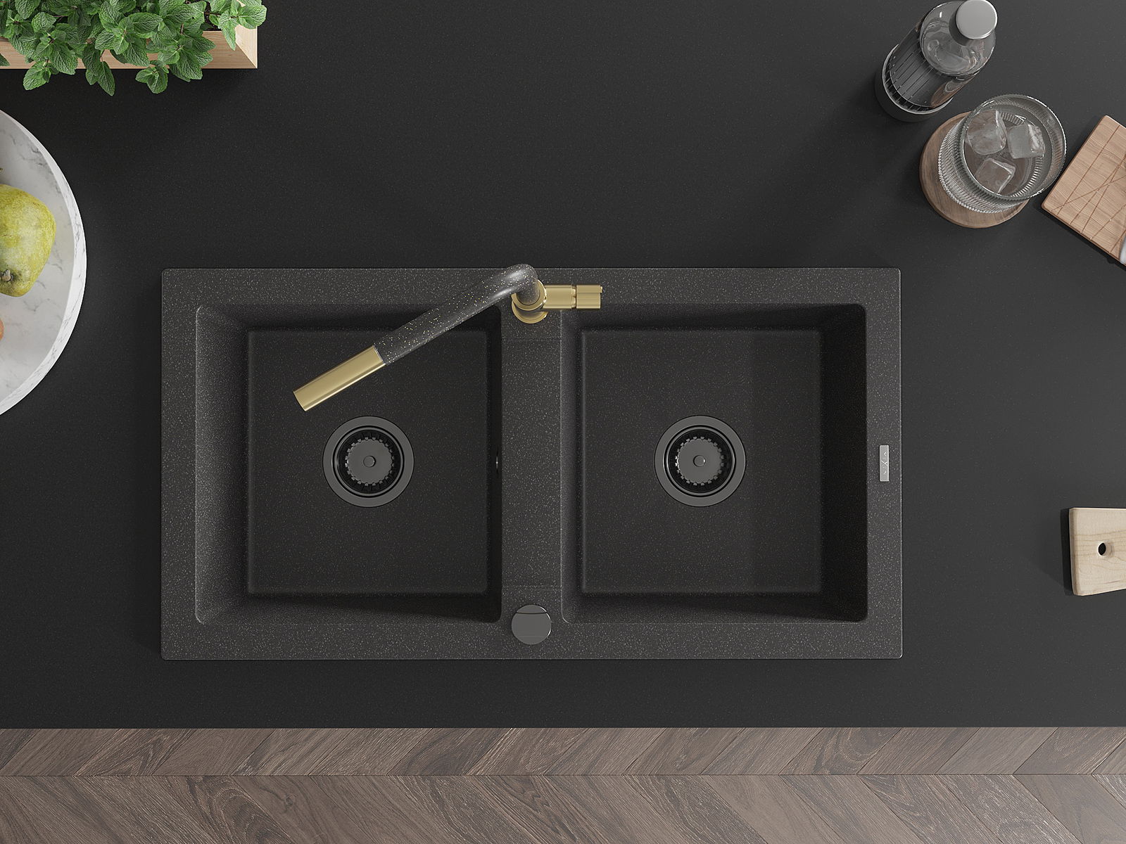 Mexen Mario divpusējs granīta izlietne ar virtuves krānu Flora, melns ieskicēts - 6504-76-670401-75-B