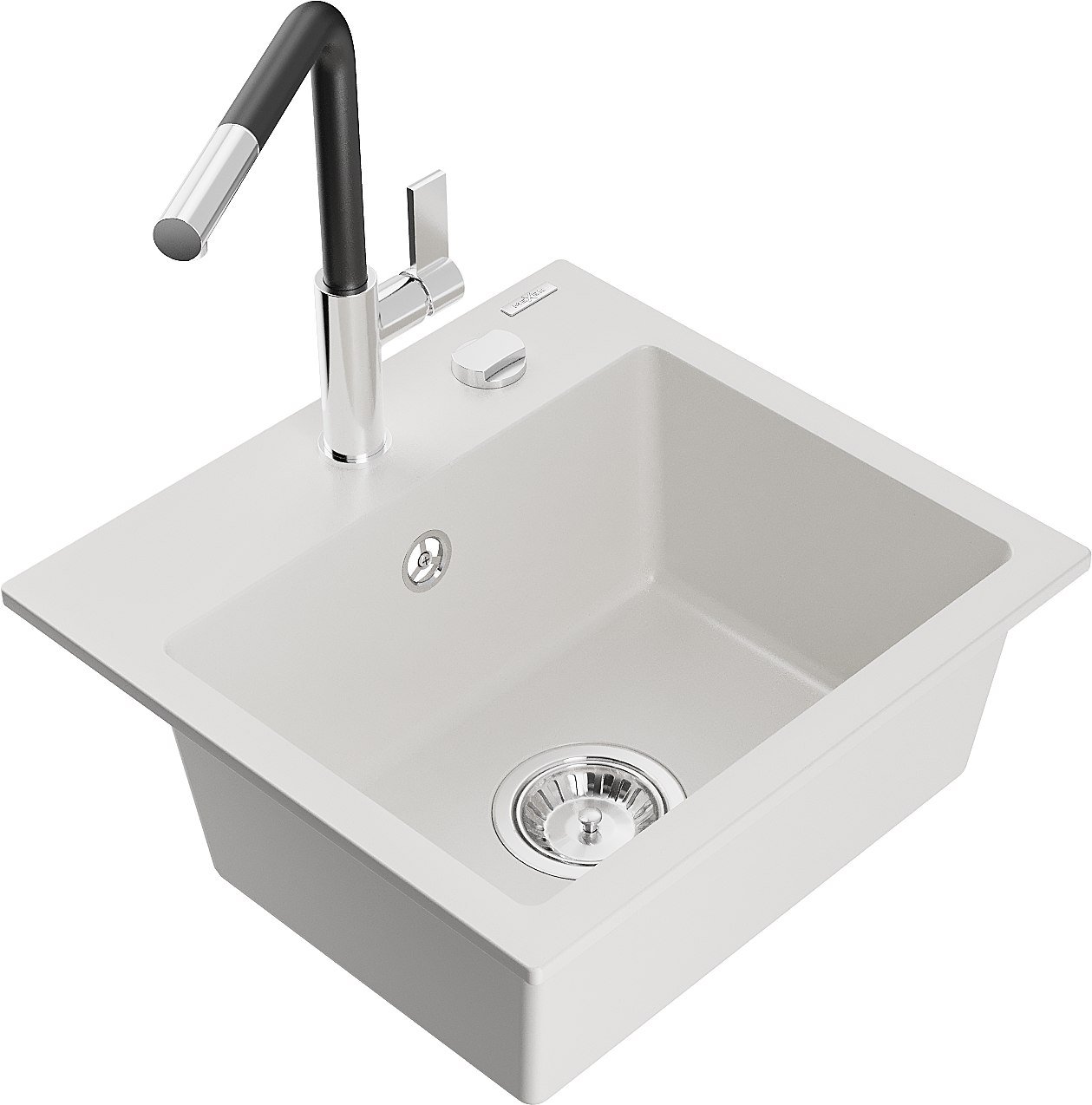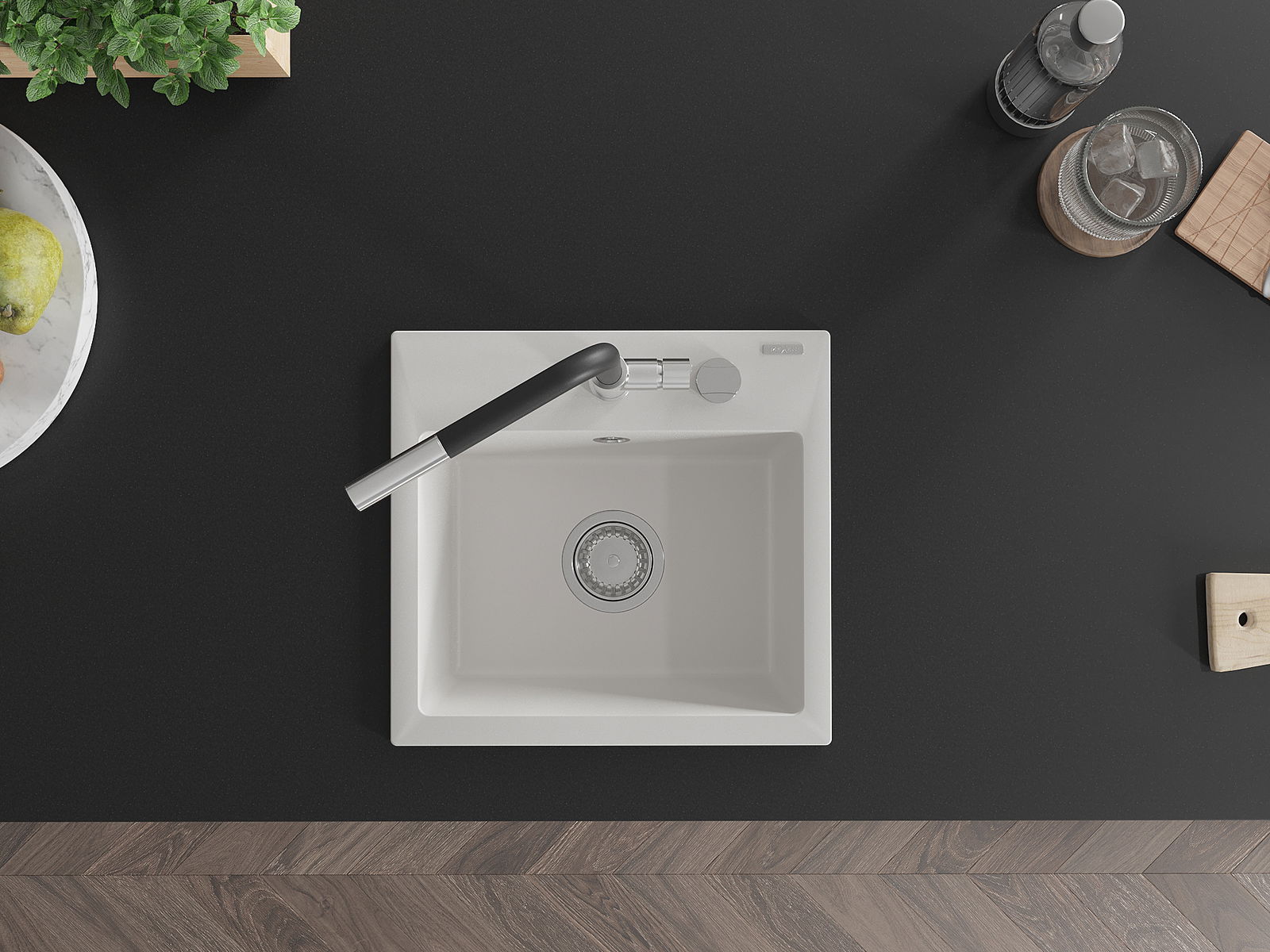 Mexen Milo granitais virtuves izlietne ar 1 nodalījumu un Flora jaucējkrānu, balta - 6505-20-670401-07