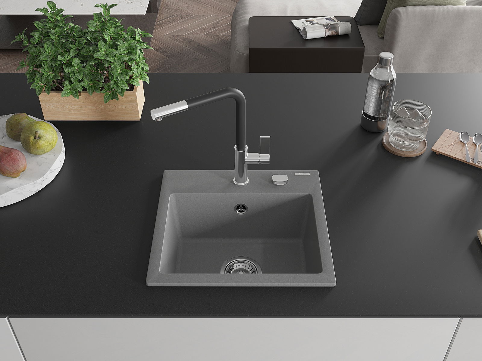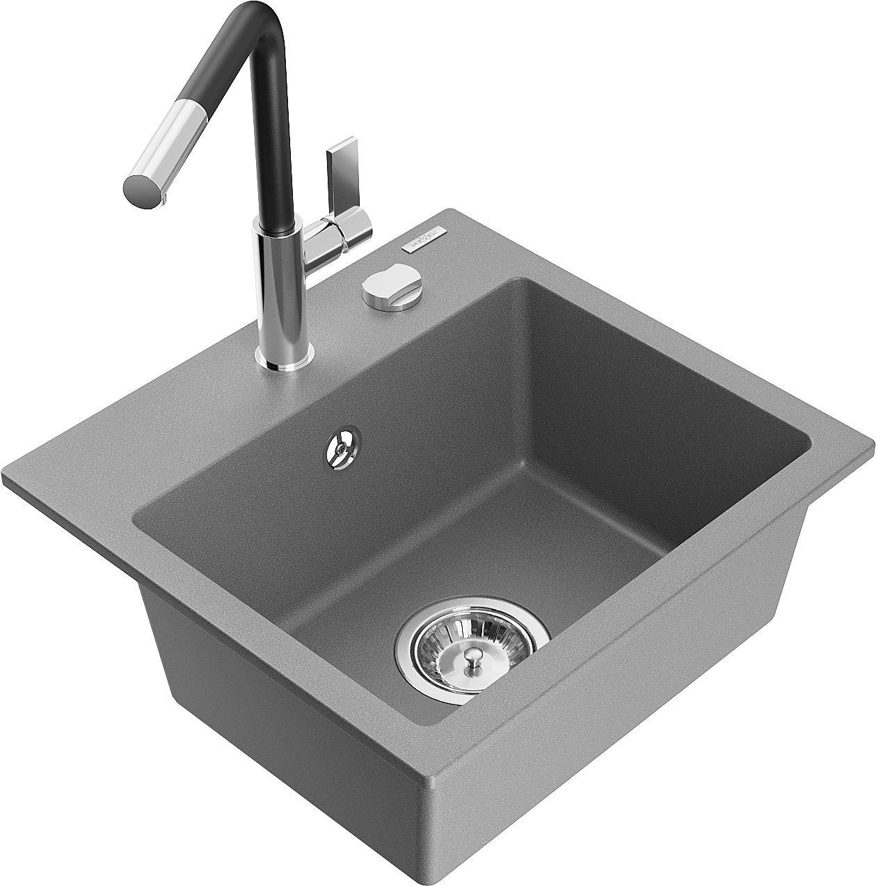 Mexen Milo granitā izlietne ar vienu nodalījumu un virtuves jaucējkrāns Flora, pelēks - 6505-71-670401-07