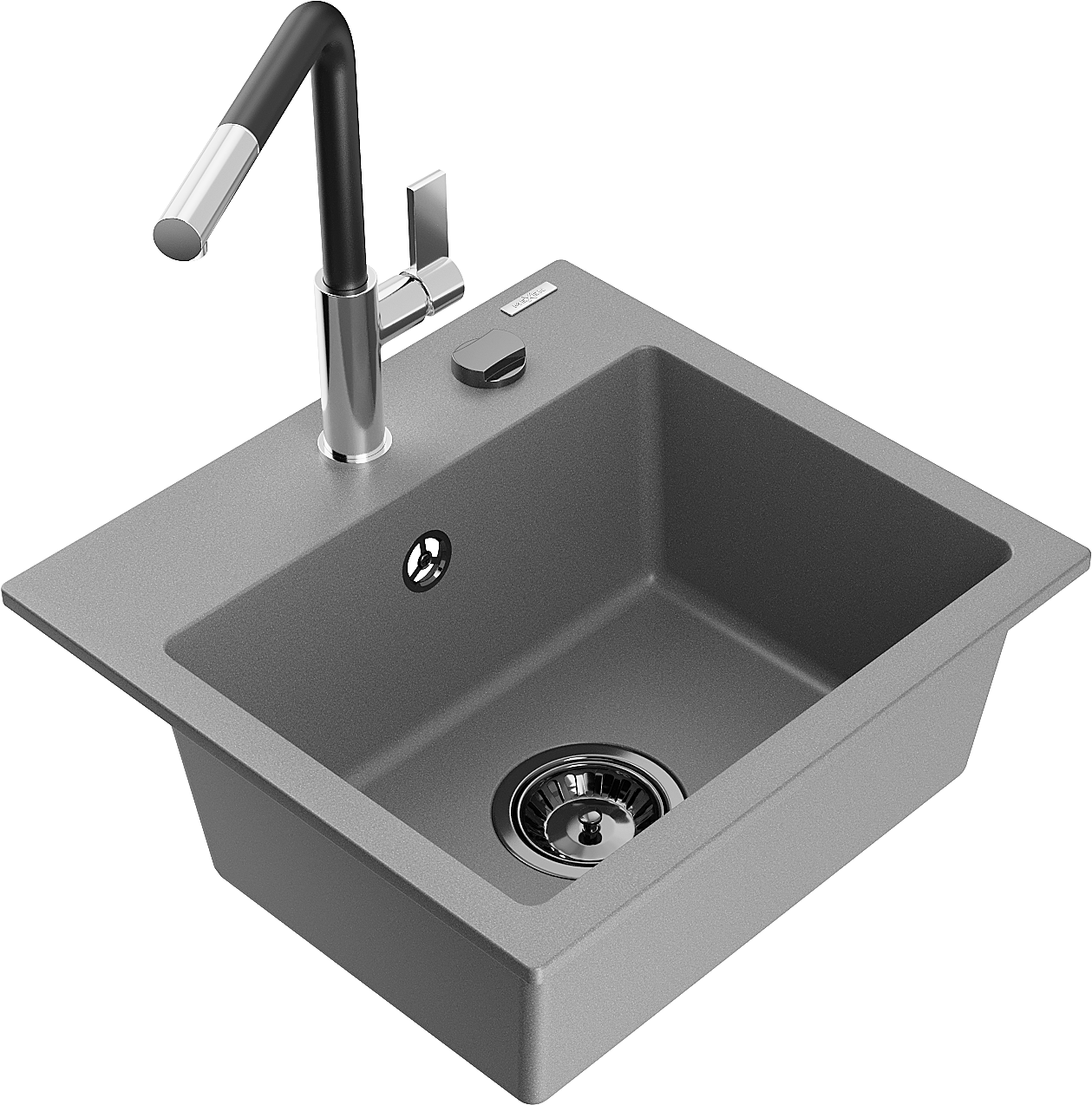 Mexen Milo granīta virtuves izlietne ar vienu nodalījumu un Flora virtuves jaucējkrānu, pelēka - 6505-71-670401-07-B