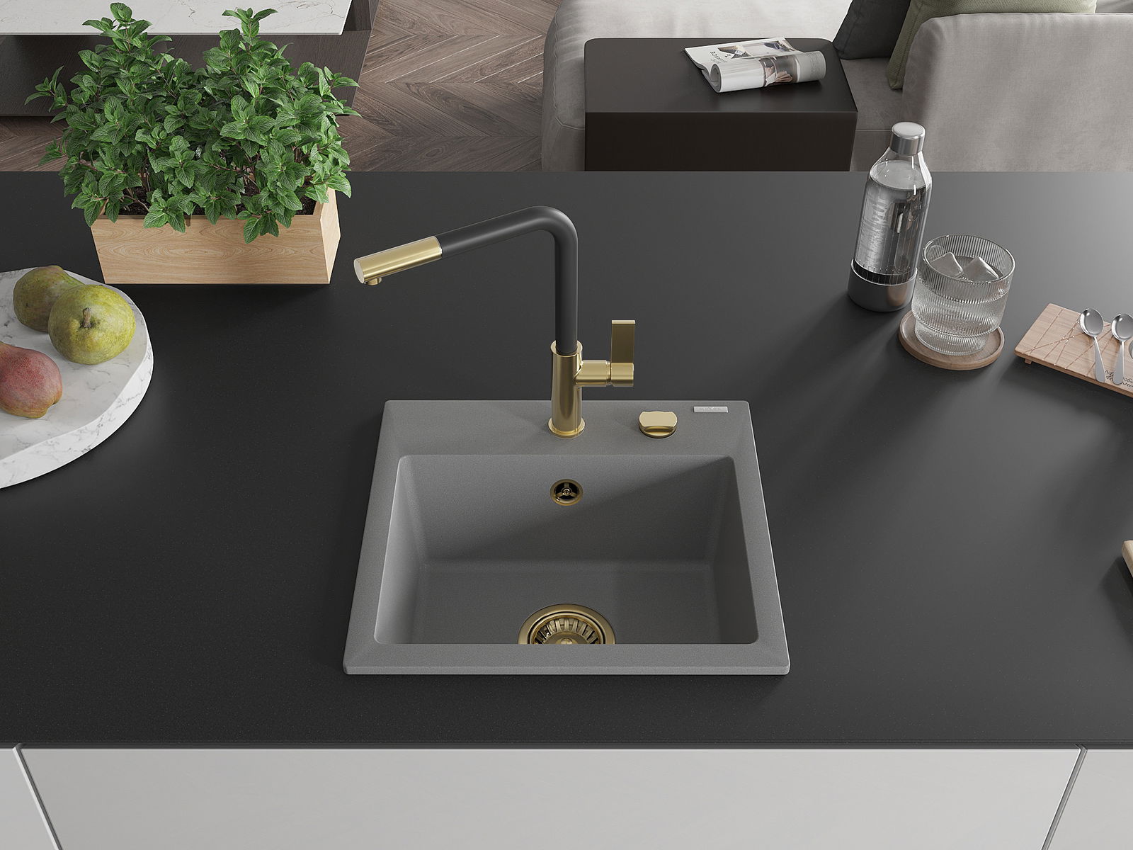 Mexen Milo granitizlietne 1-nodalīgais izlietne ar virtuvess jaucējkrānu Flora, pelēka - 6505-71-670401-57-G