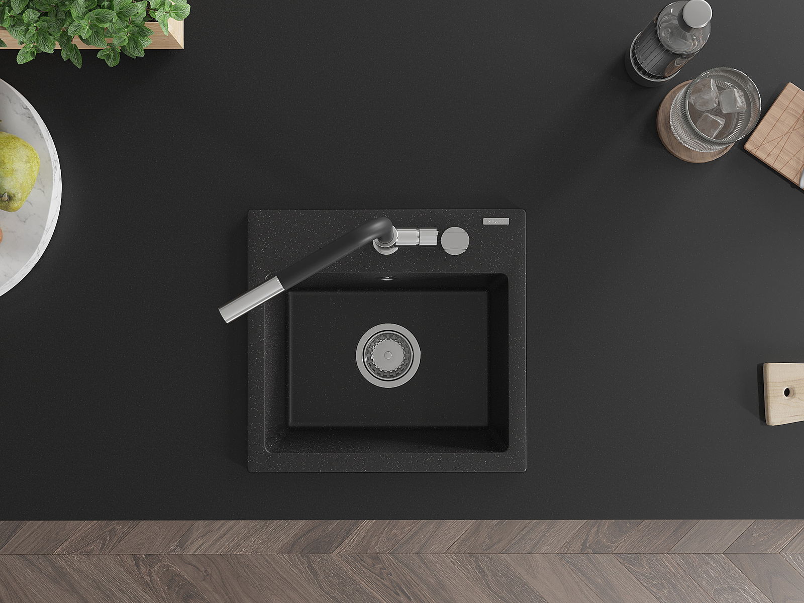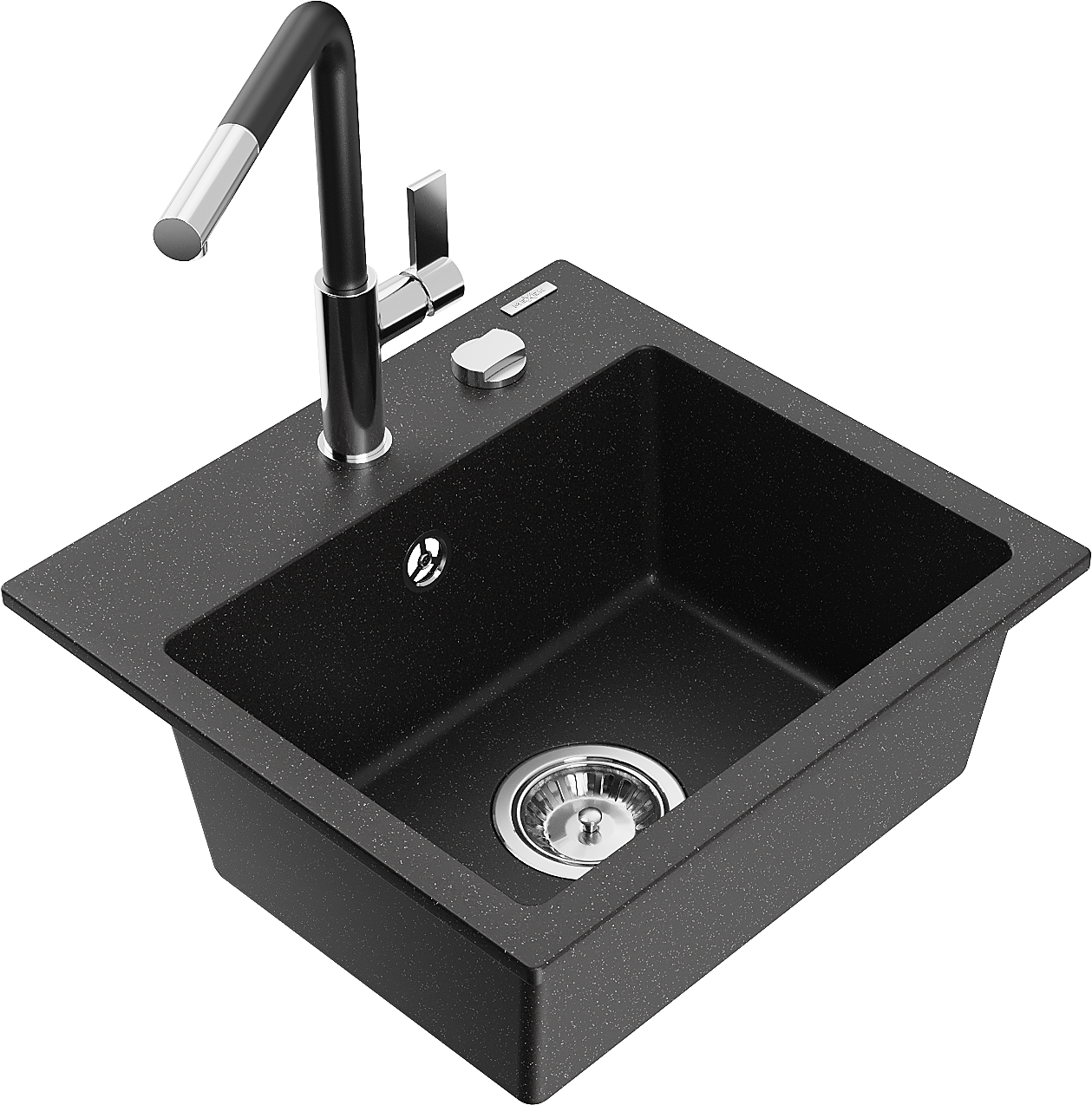 Mexen Milo 1-nodalītes granīta izlietne ar virtuves jaucējkrānu Flora, melna/sudraba metāliks - 6505-73-670401-07
