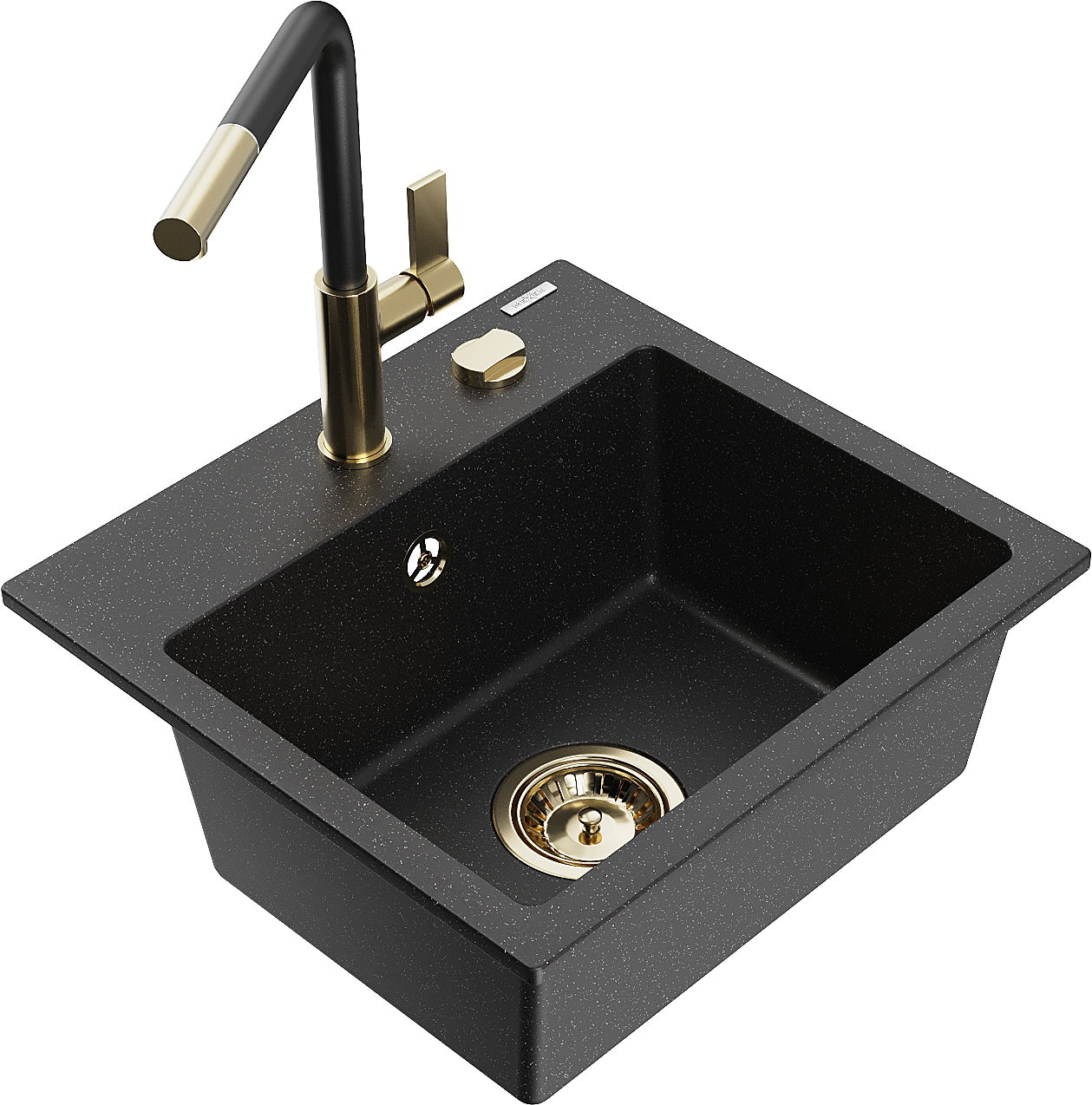 Mexen Milo vienas izlietnes granīta izlietne ar Flora virtuves jaucējkrānu, melns/sudraba metālisks - 6505-73-670401-57-G