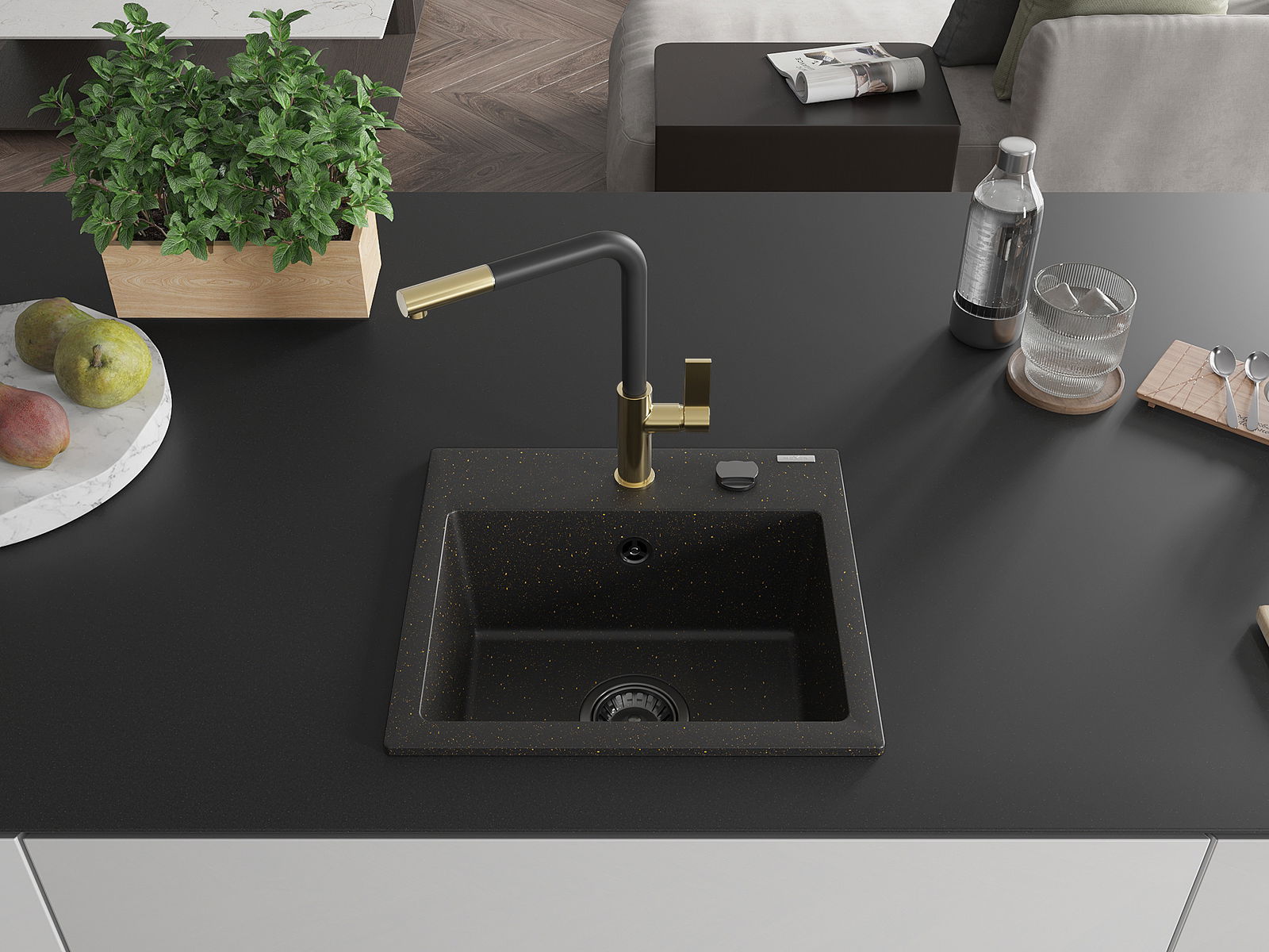 Mexen Milo granitēts virtuves izlietne ar 1 nodalījumu un Flora virtuves krānu, melns/zeltaini metālisks - 6505-75-670401-57-B